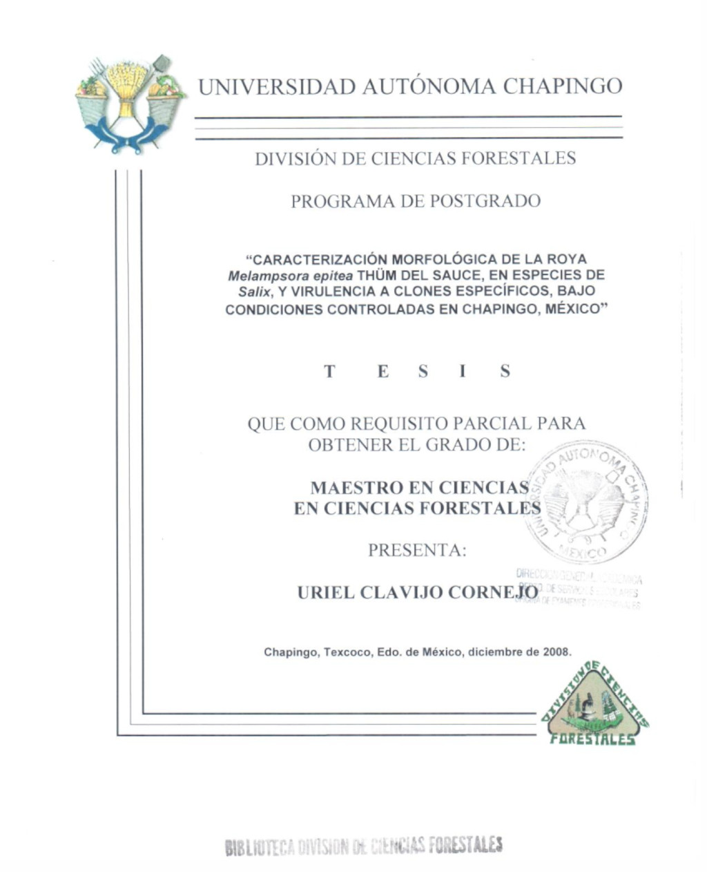 Caracterización morfológica de la roya Melantpsora epitea Thürn del sauce, en especies de Salix, y virulencia a clones específicos, bajo condiciones controladas en Chapingo, México