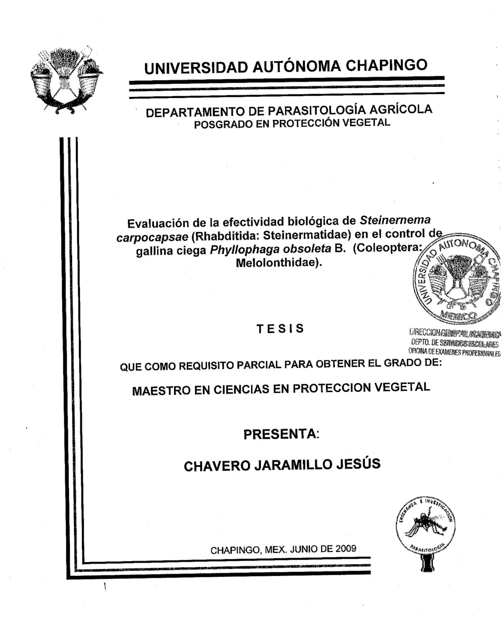 Evaluación de la efectividad biológica de Steinernema carpocapsae (Rhabditida: Seteinermatidae) en el control de gallina ciega Phyllophaga obsoleta B. (Coleóptera: Melolonthidae)