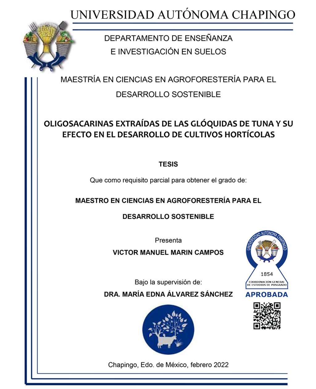 Las glóquidas de la tuna son un subproducto del proceso postcosecha del desespinado y son consideradas como un desecho lignocelulósico de baja biodegradabilidad, debido a su composición de celulosa (41 %), hemicelulosa (41 %), lignina (5 %) y su alto índice de cristalinidad (48-76 %) en las columnas de celulosa. Este residuo de difícil manejo genera impacto ambiental negativo tras cada ciclo de producción pues se desecha en bolsas plásticas, desperdiciándose propiedades que pudieran aprovecharse. La presente investigación tuvo como finalidad evaluar el efecto de oligosacarinas extraídas de glóquidas de tuna mediante hidrolisis química, en el desarrollo de algunos cultivos para generar valor agregado a este subproducto de desecho. Los análisis fitoquímicos por espectrofotometría indicaron que las glóquidas tienen un contenido promedio de betalaínas, flavonoides, fenoles y pectinas totales de 18.4 ± 3.3, 107.1 ± 8.2, 419.1 ± 47.6 y 128.7 ± 26.7 mg·100g-1, respectivamente. Estos componentes de las glóquidas le confieren gran potencial de uso en la industria de pigmentos naturales, como sustancias antioxidantes en fármacos, cosméticos y productos agroalimentarios; así como de uso agronómico como regulador del crecimiento y maduración de frutos. Dado su contenido de ácido galacturónico, dosis del extracto de glóquidas se evaluaron como bioestimulante foliar en el desarrollo, rendimiento y calidad de calabaza (Cucurbita pepo L.), cebolla (Allium cepa L.) y jitomate (Solanum lycopersicum). Los resultados del experimento de invernadero mostraron efectos significativos positivos del ácido galacturónico en el rendimiento de flores de calabaza, área foliar, biomasa radical y crecimiento en altura de la variedad Grey Zucchini; en cebolla longitud de tallo, número de brotes, biomasa radical, follaje, diámetro del tallo y biomasa de bulbos; en jitomate en diámetro basal y apical. La magnitud del efecto dependió de la dosis, parámetro evaluado y la especie de cultivo.