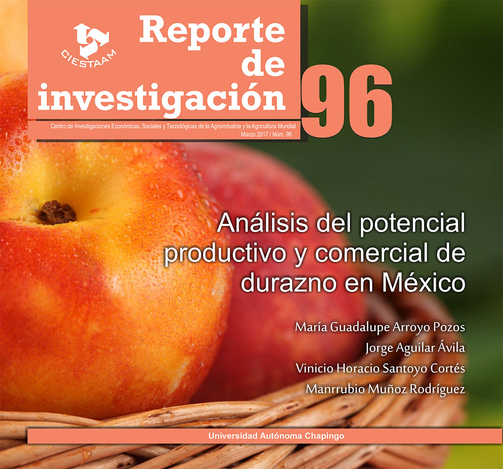 Arroyo-Pozos, María Guadalupe; Aguilar-Ávila, Jorge, Santoyo-Cortés, Vinicio Horacio; Muñoz-Rodríguez, Manrrubio. 2017. Análisis del potencial productivo y comercial de durazno en México. Reporte de Investigación núm. 96. UACh-CIESTAAM, México. 41 p.