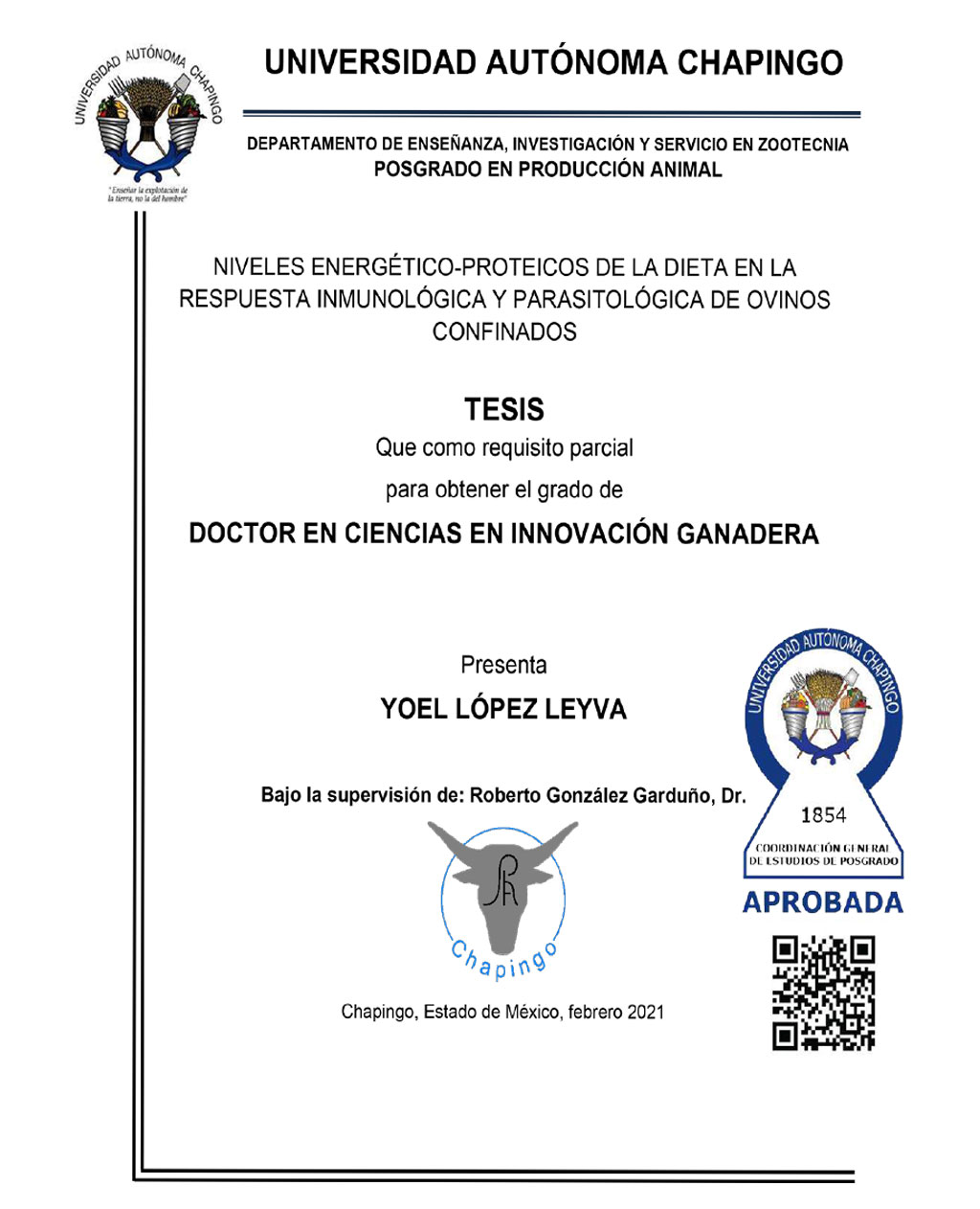 Se realizó una revisión de literatura sobre el desequilibrio proteico-energético causado por nematodos gastrointestinales (NGI) en pequeños rumiantes y su relación con la respuesta inmunológica. Se discutió el papel de la suplementación de energía y proteína en el desarrollo de resistencia a NGI. En el primer estudio se evaluó la respuesta parasitológica y la inmunidad humoral de corderos Pelibuey infectados experimentalmente con Haemonchus contortus, con el empleo dos niveles de energía y de proteínas en la dieta. Se determinó el conteo fecal de huevos (CFH), el volumen celular aglomerado (VCA), las proteínas plasmáticas totales (PPT) y los niveles de inmunoglobulina (IgA, IgG e IgM). Las dietas altas en energía tuvieron los menores CFH (p<0.01) independientemente de los niveles de proteína. El efecto del alto nivel de energía también se observó a través del tiempo, el CFH disminuyó mientras que el VCA y la PPT aumentaron. También se observó el efecto del sexo, donde se obtuvieron niveles más altos de inmunoglobulina en las hembras que en los machos (p<0.05). Sin embargo, los niveles de energía y proteína de las dietas no afectaron los niveles de inmunoglobulinas. En un segundo estudio en ovejas Pelibuey en condiciones de pastoreo se evaluó el efecto del estado reproductivo y dos niveles de energía alta (N= 24) y baja (N=24) y proteína alto (N=24) y bajo (N=24) sobre la respuesta parasitológica y hematológica. Se determinó el CFH, VCA y eosinófilos (EOS). Los valores del CFH y VCA, mostraron un mejor comportamiento (p<0.05) en los animales vacíos y con altos niveles de proteína en la dieta. La suplementación con niveles altos de proteína mejora la respuesta hematológica y contra parásitos de ovejas Pelibuey en condiciones de pastoreo, mientras que la energía afecta la respuesta inmune parasitológica y humoral de corderos Pelibuey infectados.