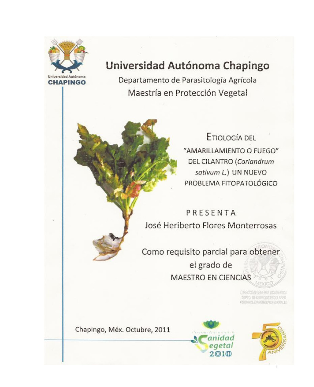 El cilantro (Coriandrum sativum L.) es una especie importante por su uso alimenticio e industrial. En México el estado de Puebla es el principal productor, donde recientemente se observó la incidencia del síndrome conocido como “Amarillamiento o fuego del cilantro”, su origen aún desconocido y las numerosas pérdidas ocasionadas, lo convirtieron en un serio problema. Por lo anterior este trabajo tuvo como objetivos determinar la etiología de la enfermedad y su comportamiento en relación a 7 genotipos de cilantro; se realizaron ensayos con factores abióticos; se identificaron vectores asociados y se efectuaron pruebas de detección de bacterias, hongos y virus. Los resultados obtenidos, revelan que esta enfermedad es causada por el Turnip Yellow Virus (TuYV) y otros virus no identificados, que son transmitidos por Myzus persicae y Macrosiphum euphorbiae, y que asociados con tres especies de Fusarium, forman un complejo que incrementa la severidad del daño.