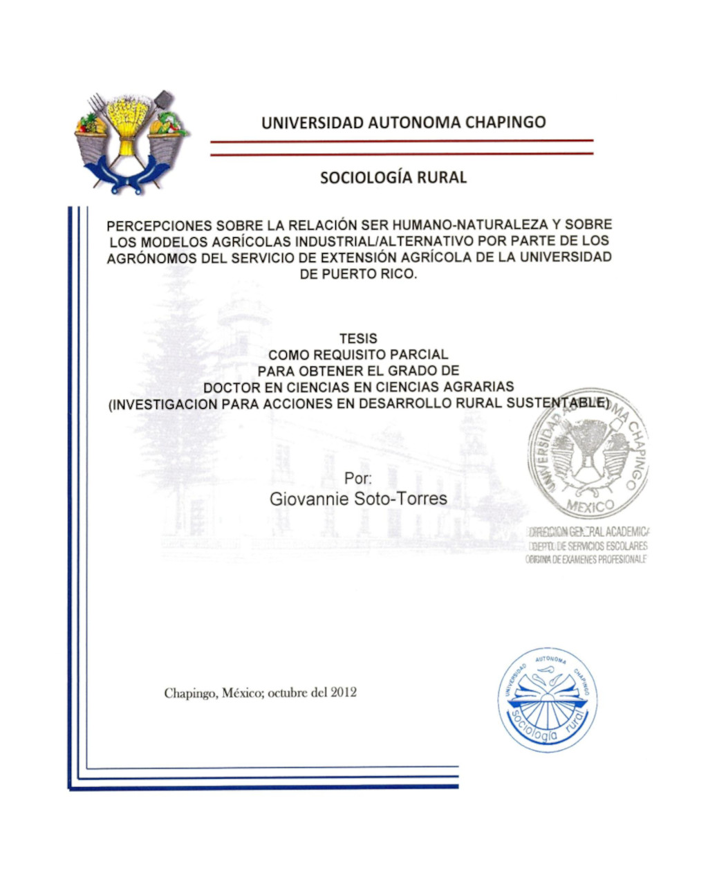 Percepciones sobre la relación ser humano/naturaleza y sobre los modelos agrícolas industrial/alternativo por parte de los agrónomos del servicio de extensión agrícola de la universidad de Puerto Rico