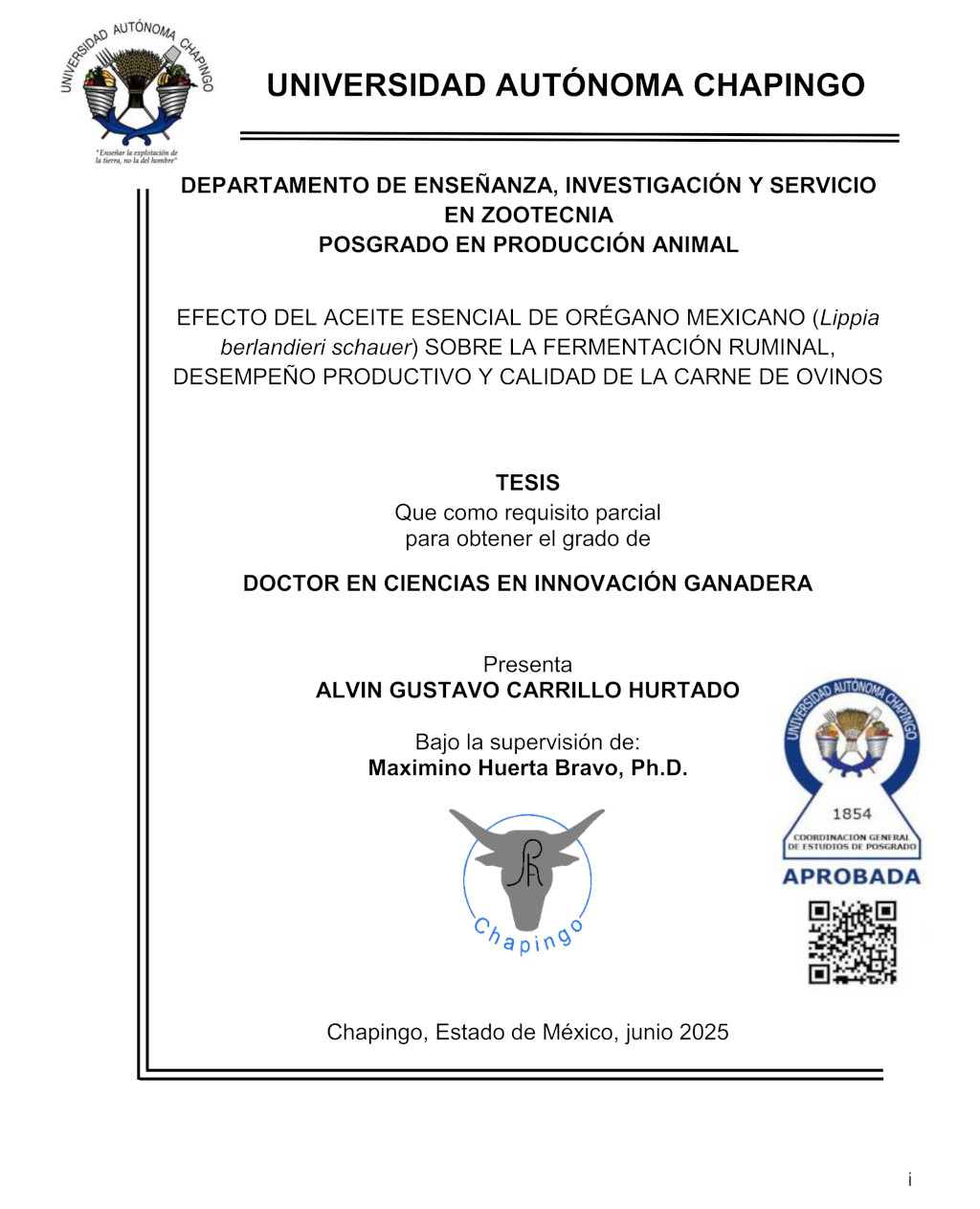 Efecto del aceite esencial de orégano mexicano (Lippia berlandieri schauer) sobre la fermentación ruminal, desempeño productivo y calidad de la carne de ovinos