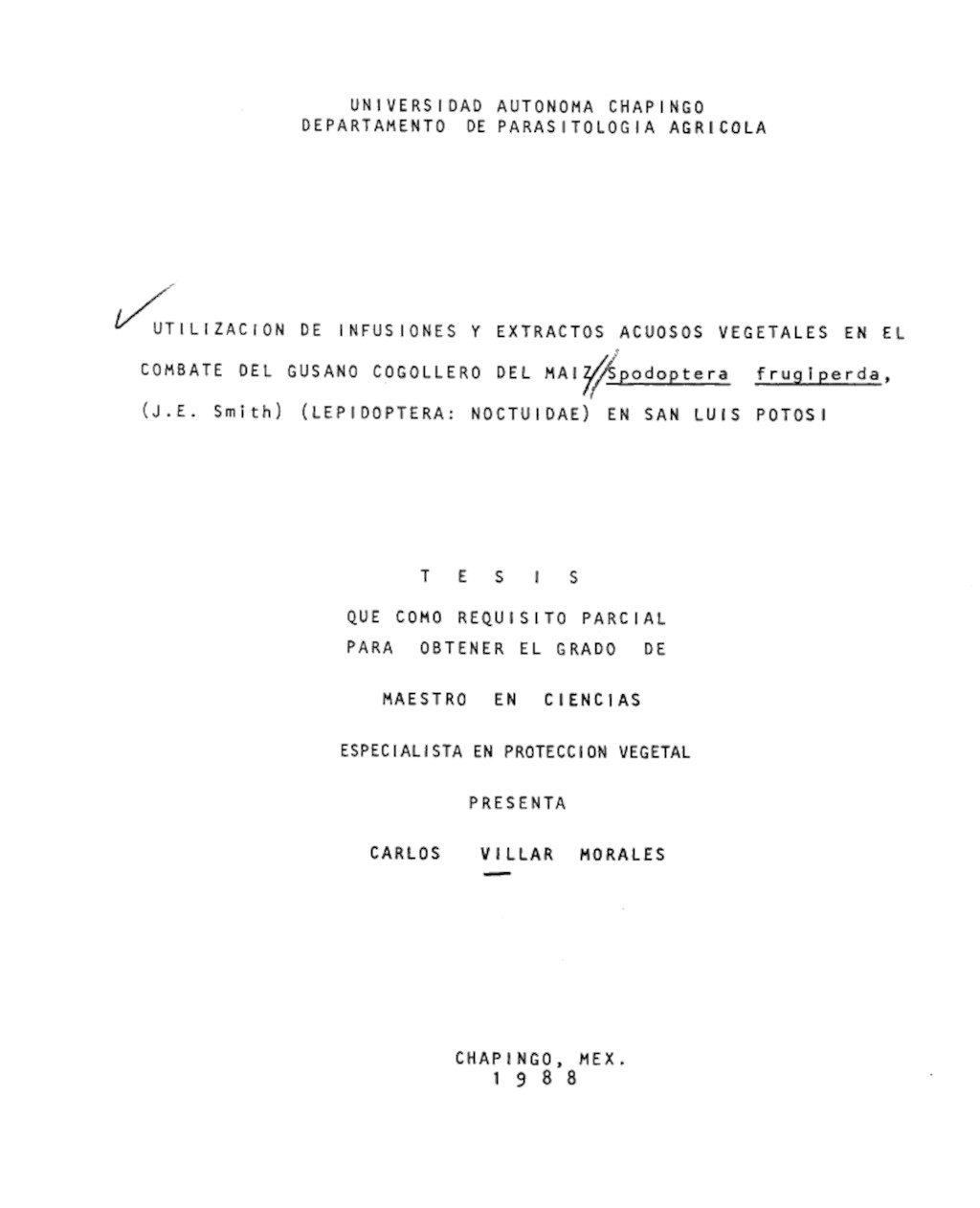 Utilización de infusiones y extractos acuosos vegetales en el combate del gusano cogollero del maíz Spodoptera frugiperda, (J.E. Smith) (Lepidoptera: Noctuidae) en San Luis Potosí