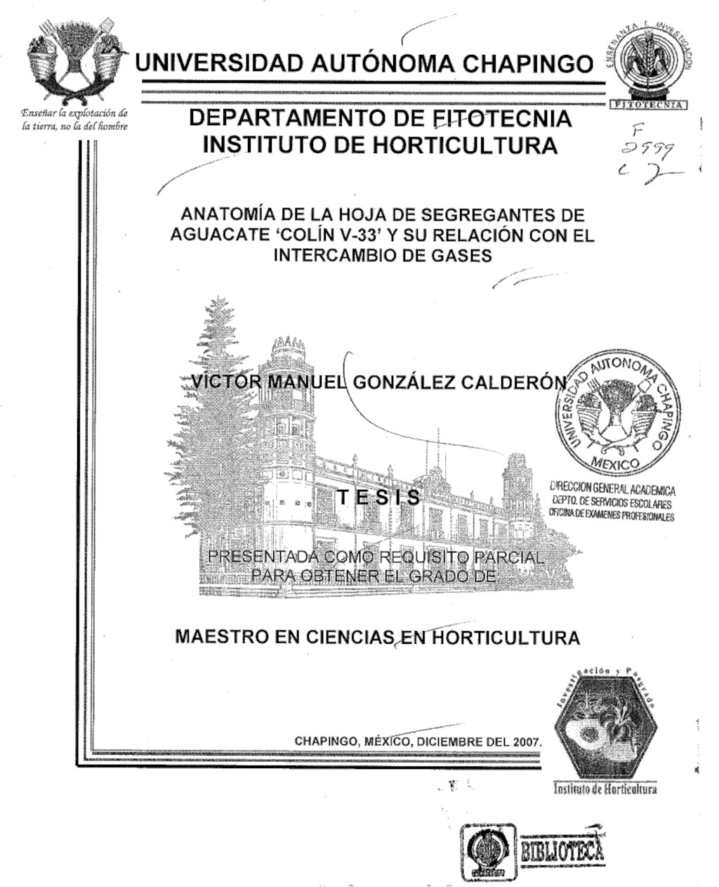 De acuerdo a la literatura, las características anatómicas de la hoja están directamente relacionadas con el intercambio de gases, por lo que estudió este aspecto y se caracterizó la anatomía de la hoja en 48 segregantes del aguacate 'Colín V-33'. Para lo cual se realizaron cortes anatómicos transversales de lámina foliar, incluyendo vena central, donde se evaluaron características de estratos y de células en particular de parénquima en empalizadas I y elementos de vaso del xilema. Se utilizaron métodos de análisis estadístico multivariables y de correlación. Se encontró en la estructura canónica, que las variables más importantes de la primera función canónica (FC 1) fueron el parénquima en empalizada II, ancho de célula de mesófilo en empalizada I y el área de la célula de mesófilo en empalizada I; para la FC2 fueron el grosor de la epidermis del haz, el área de la nervadura central, el diámetro de la nervadura central, el área del xilema y área del parénquima de la nervadura central; y para el caso de la FC3 fueron el mesófilo en empalizada I, el largo de célula de mesófilo en empalizada I y la relación largo/ancho de célula de mesó:filo en empalizada I. Existió la formación de cuatro grupos de acuerdo al análisis de agrupación. En el análisis de correlación donde se incluyeron las variables de intercambio de gases de la hoja, en general no se encontró relación entre estas variables fisiológicas y las características anatómicas de la hoja estudiadas, sin embargo, para se encontró una relación entre la concentración de C02 subestomático y el grosor de la epidermis del envés de la hoja.