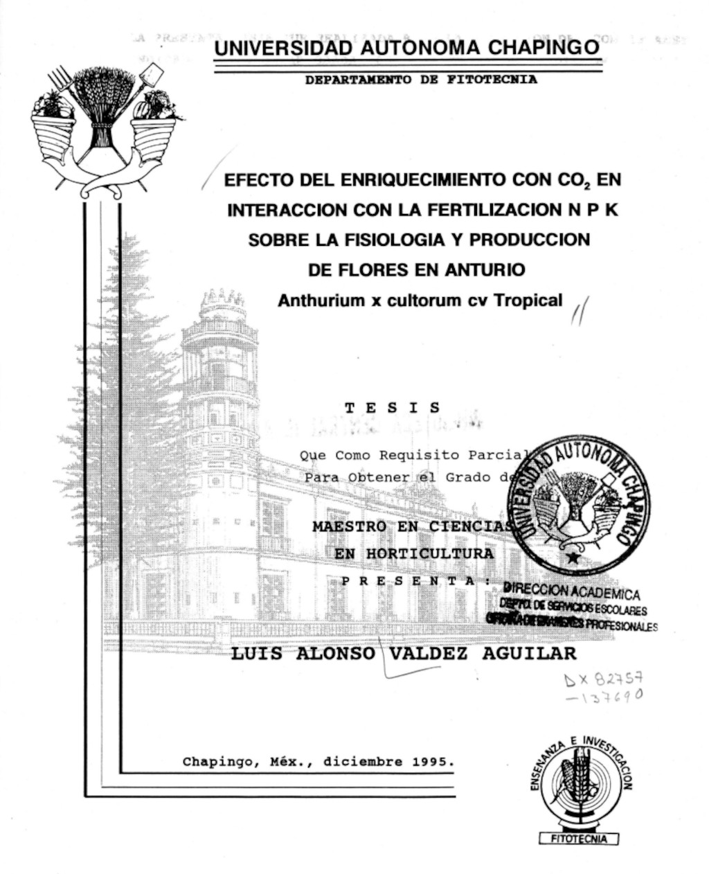 El anturio Anthurium x cultorum (=Anthurium andreanum) es una planta ornamental empleada como flor cortada, cuya producción implica una alta inversión por la necesidad de instalar invernaderos equipados y porque el material vegetal es muy costoso. Es necesario para este tipo de especies emplear técnicas que aumenten el rendimiento y calidad de las flores, lo que ayudara a mantener competitivos a los productores. El aumento en la concentración de CO2 en el ambiente ha demostrado ser una de estas técnicas ya que eleva la productividad y calidad en numerosas especies hortícolas y florícolas. Por los motivos expuestos se realizó una investigación con el objetivo de determinar si este cultivo responde favorablemente al enriquecimiento con gas carbónico en la atmosfera, interactuando con los niveles de fertilización del nitrógeno, fosforo y potasio. En Xocotlan, Texcoco, Mex., se estableció un experimento que consistió en tres niveles de CO2: testigo, 600 y 1200 ppm. Estos niveles de CO2 se combinaron con dos niveles de nitrógeno en la solución nutritiva: 130 y 200 ppm; con dos niveles de fosforo: 30 y 50 ppm; y dos niveles de potasio: 180 y 270 ppm. El diseño utilizado fue un bloques al azar con 6 repeticiones, considerando a los bloques anidados en las concentraciones de gas carbónico. La información obtenida se procesó mediante el sistema SAS y la comparación de medias se efectuó mediante la prueba de Tukey con α ≤ 0.05. El cultivar utilizado fue Tropical, de origen holandés. Los tratamientos con CO2 iniciaron el 10 de Noviembre de 1994, y se aplicaron diariamente durante un periodo de seis meses. El CO2 produjo incrementos sustanciales en la tasa fotosintética, que en promedio oscilaron entre un 59.2 y 75.8%. Mediante una regresión de tercer grado se pudo estimar que el punto de saturación por CO2 para el anturio es de alrededor de 650 ppm de concentración interna, mientras que el punto de compensación es de 120 ppm. Para lograr estos niveles de CO2 interno, mediante una regresión lineal, se estimó que en el ambiente es necesario una concentración de 786 y 155 ppm, respectivamente. El enriquecimiento con CO2 provocó el cierre de los estomas ya que se encontró que la conductancia estomatal se redujo entre un 6.7 y 29.8% en promedio; asimismo, la resistencia mostró un aumento del 19.8% en las plantas expuestas a 1200 ppm de CO2. La presencia de un nivel incrementado de gas carbónico en el ambiente también fue el causante de que la concentración del CO2 en el mesófilo de las hojas se elevase significativamente, llegando a ser desde 42.1 hasta un 173.1% en promedio. A pesar del cierre de los estomas, no se obtuvo una disminución en la tasa de traspiración de las plantas, sino más bien un incremento que osciló entre 7.8 y 28.0%; se argumenta que esto se debió al horario de muestreo. Sin embargo, aunque no se redujo la transpiración, la fotosíntesis neta fue lo suficientemente alta para que esto se reflejase en un aumento en la eficiencia en el uso del agua, por lo que se determina que los anturios expuestos a un nivel alto de CO2 ambiental fijan más gas carbónico por unidad de agua transpirada. El empleo de concentraciones altas de CO2 en la atmosfera ocasionó que la tasa de crecimiento de las hojas y pedúnculos florales se incrementase, por lo que estos terminan su desarrollo 10 días antes que el tratamiento testigo. En el caso de la espata, no se obtuvo un adelanto en el desarrollo, aunque si una mayor tasa de crecimiento; esto explica el que con niveles altos de CO2 se lograsen espatas más grandes. El incremento de la fotosíntesis se traduce en una elevación de todas las variables respuesta relacionadas con el peso fresco y seco. Lo anterior ocurrió tanto en la hoja, como en el peciolo, pedúnculo floral, espádice y espata. Las hojas que dieron origen a las flores que se desarrollaron durante el experimento mostraron un sensible aumento en el área foliar cuando se les aplicó un nivel de 600 ppm de CO2; este incremento fue en alrededor de 25.6 cm2 , mientras que con 1200 ppm fue de sólo de 1.5 cm2. El reducido aumento del área foliar en el tratamiento con 1200 ppm en contraste con el sustancial incremento del 18.4% en su peso seco ocasionan que el peso específico de las hojas de las plantas sometidas a este tratamiento hayan mostrado una elevación significativa, del orden del 17.9%. El peciolo también respondió al CO2 , ya que su longitud y diámetro se elevaron; sin embargo, es el diámetro el que muestra una respuesta más notoria, especialmente con 600 ppm de CO2 ambiental. Este incremento en el diámetro ocasiona incluso que el peso específico del peciolo se elevase. La calidad de las flores mejoró en las plantas tratadas con 600 ppm de CO2 , ya que la longitud y diámetro del pedúnculo sostuvo un aumento del 11.2 y 13.1%, respectivamente. Sin embargo, estos no se reflejaron significativamente sobre el peso específico. Otro parámetro de calidad es el tamaño de la espata, el cual respondió favorablemente a ambos niveles de CO2; la longitud, ancho, y, en consecuencia, su superficie, mostraron incremento de hasta 11.6, 6.3 y 19.9%, respectivamente. El espádice, por el contrario, mostró un aumento muy limitado en la longitud, de alrededor del 3.0 y 4.9%, mientras que el diámetro sufrió una reducción del 8.4% en el tratamiento con 1200 ppm. El rendimiento de flores sostuvo un incremento del 18.7% con 600 ppm de CO2 , en tanto que con 1200 ppm el aumento fue del 26.0%. Con esto, se puede concluir que con 1200 ppm de gas carbónico en el ambiente se logra la mayor producción de flores. Sin embargo, la diferencia entre ambos niveles del gas fue de solo un 6.1%, en tanto que el costo de elevar la concentración basta 1200 ppm se triplica. Por lo anterior, se concluye que el nivel óptimo de gas carbónico es de 600 ppm, para lograr el máximo beneficio económico. El nitrógeno interactuó significativamente con el CO2 