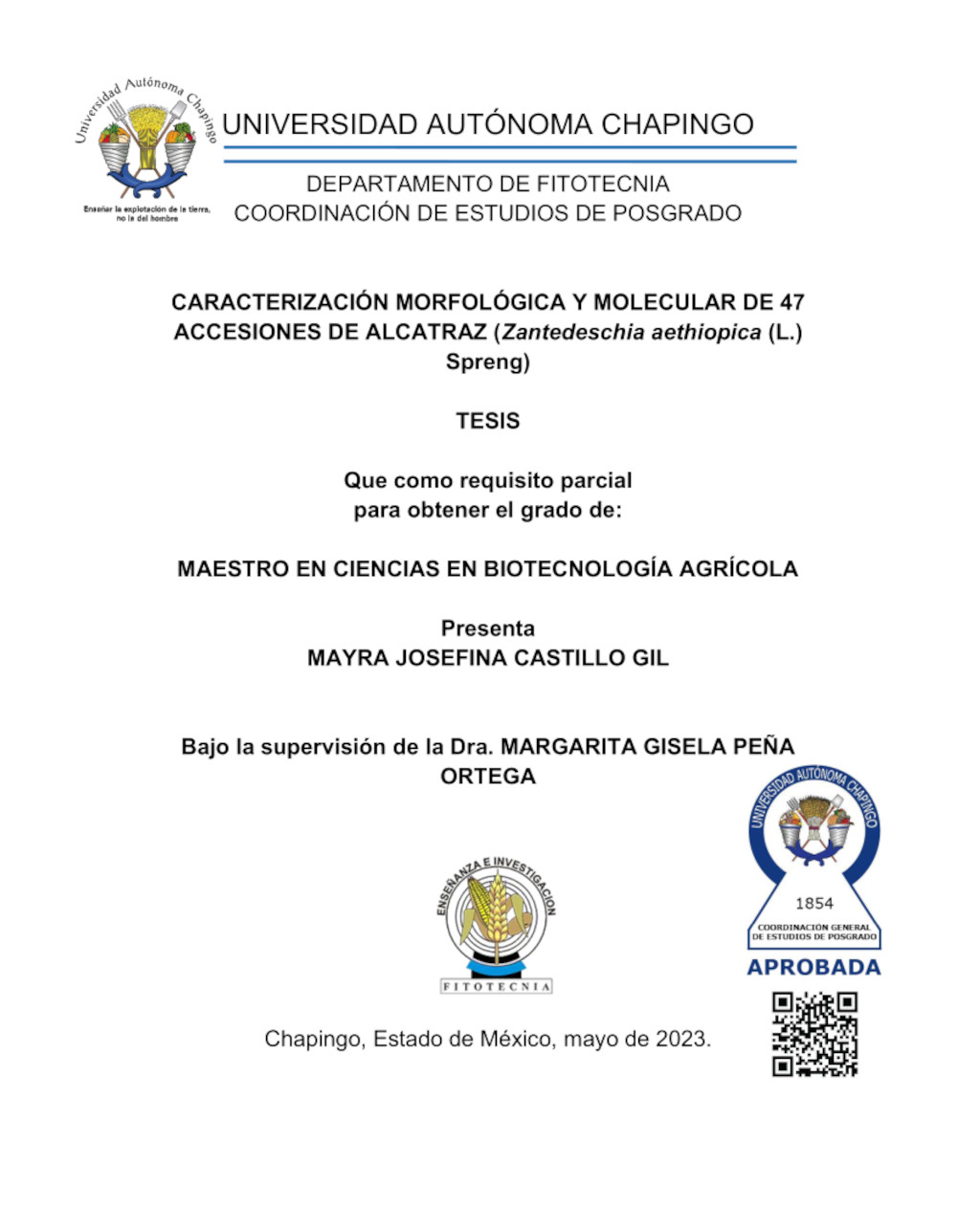 El alcatraz o cala es una planta ornamental originaria del sur de África. En México, se cultiva principalmente el blanco o criollo y actualmente se cuenta con tres variedades de alcatraz (Zantedeschia aethiopica (L) K. Spreng) generadas como flor de corte que representa un alto valor comercial en las zonas rurales de México. El presente trabajo tuvo como objetivos la caracterización morfológica y molecular de 47 accesiones de alcatraz provenientes de las localidades de La Perla, Tuzantla y Elotepec pertenecientes al estado de Veracruz y el sitio de Chapingo, del municipio de Texcoco, Estado de México. La caracterización morfológica se llevó a cabo mediante la evaluación in situ de 40 caracteres morfológicos establecidos en la “Guía Técnica para la Descripción Varietal de la Cala” del SNICS. Los resultados obtenidos en las variables cuantitativas fueron comparados mediante análisis multivariado, en el cual los valores propios indicaron que la mayoría de los rasgos cuantitativos relacionados con longitud y anchura del limbo, altura y longitud de la espata, longitud del peciolo y altura de la planta, contribuyeron en mayor medida a la diversidad total del germoplasma, mientras que en el caso de las variables cualitativas aquéllas relacionadas con el color de la espata, el espádice y los tallos contribuyeron en mayor grado a la variabilidad observada. Los marcadores morfológicos detectaron diversidad genética entre UBC´s y las diferenciaron mediante un análisis de conglomerados por dendrograma con el programa SAS/ STAT® versión 9.4. La caracterización molecular se llevó a cabo por medio de la amplificación del ADN mediante PCR con el uso de 22 marcadores tipo ISSR, obteniendo un polimorfismo general de 83.51 %. El análisis de varianza molecular (AMOVA) (P < 0.0001) reveló la presencia de un grado significativo de variabilidad genética, en su mayoría compartimentada dentro poblaciones de accesiones y un índice de información de Shannon-Weaver (I) con un valor general de I=0.69 entre las cuatro poblaciones colectadas y analizados usando el software InfoGen®. Los resultados obtenidos indican que los marcadores moleculares ISSR son adecuados para identificar variación intraespecífica en Z. aethiopica. El iniciador ISSR2 aportó el mayor contenido de información polimórfica por lo que resultó ser el más adecuado para la identificación de genotipos.
