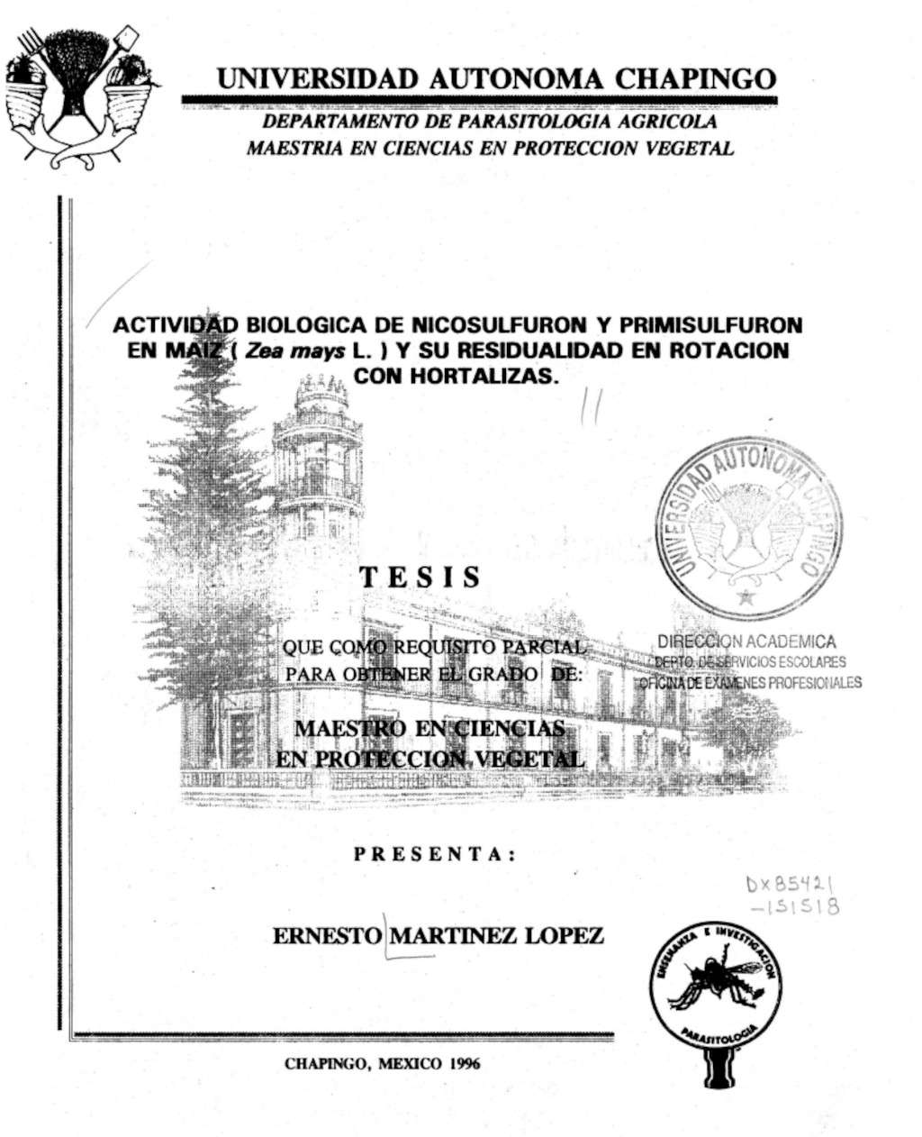 El maíz (Zea mays L.) es un elemento vital en las dietas de los países en vías de desarrollo, ya que contribuye con el 50% de Ia proteína, constituyendo así una importante fuente de energía en su dieta básica. Su producción se ve afectada por varios factores. siendo uno de ellos muy importante el efecto que ejerce Ia presencia de maleza durante sus primeras etapas de desarrollo (periodo crítico de competencia, establecido dentro de los 60 días después de Ia emergencia del cultivo). Para su control se ha recurrido a diversas alterativas, de las cuales el control químico (uso de herbicidas) se ha considerado como Ia mejor, para lo cual se utilizan productos preemergentes y actualmente, debido a las inestables condiciones de lluvia, se ha generalizado el uso de herbicidas postemergentes. Estas sustancias presentan dentro de sus características una completa selectividad al cultivo y un amplio espectro de control de maleza; sin embargo, una de sus desventajas Ia constituyen los efectos ocasionados por Ia persistencia de estas moléculas sobre los cultivos que se establecen en rotación con maíz, especialmente cuando se trata de productos hortícolas. Por lo que, teniendo como base lo establecido, anteriormente se planteó el presente estudio, con los siguientes objetivos: 1) Evaluar Ia eficacia biológica de nicosulfurón y primisulfurón para el control postemergente de maleza en el cultivo de maíz; 2) Evaluar Ia persistencia de ambos herbicidas sobre calabaza, midiendo el efecto a distintos intervalos después de su aplicación intencional al suelo; 3) Evaluar la persistencia de estas moléculas al ser aplicadas en maíz, con Ia finalidad de prever daños en Ia rotación calabaza-pepino; 4) Evaluar Ia eficacia biológica de nicosulfurón y primisulfurón para el control postemergente de zacate johnson (Sorghum halepense L.) proveniente de rizoma, en invernadero y 5) Evaluar Ia fitotoxicidad de los productos en el cultivo de maíz. El estudio se estableció en el Campo Agrícola Experimental de Ia Universidad Autónoma Chapingo, para lo cual se sembró maíz var. 107; el diseño experimental utilizado fue bloques completos al azar, con diez tratamientos y cuatro repeticiones. Cada unidad experimental estuvo constituida por cinco surcos, separados a 0.80 m., por diez metros de largo (= 40 m2). Como parcela útil se consideró los tres surcos centrales. Los tratamientos evaluados fueron: primisulfurón a dosis de 22.5, 30.0, 37.5 y 45.0 g i.a./ha; y nicosulfurón a dosis de 40.0, 50.0 60.0 y 70.0 g i.a.lha; así como también un testigo siempre limpio y un testigo siempre enmalezado. Por otra parte, se condujeron tres bioensayos en invernadero utilizando calabaza, calabaza y pepino, y zacate johnson, respectivamente, como especies de estudio. Para evaluar Ia respuesta del maíz hacia los tratamientos, se tomaron en consideración las siguientes variables: fitotoxicidad y control de maleza. Para los bioensayos el criterio de evaluación fue porcentaje de daño visual sobre calabaza y pepino, y para el bioensayo de zacate johnson se consideró Ia variable porcentaje de control. Realizado el procedimiento de análisis de varianza y las comparaciones de medias por medio del paquete estadístico SAS (Tukey, oc= 0.05), se obtuvieron los siguientes resultados: se presentó una ligera clorosis en el cogollo de las plantas de maíz, efecto que fue superado rápidamente a los 15 días después de Ia aplicación (DDA). La maleza dominante estuvo constituida por cinco especies: Simsia amplexicaulis, Sycios angulatus, Amaranthus hybridus, Chenopodium album y Eleusine multiflora. La dosis optima de primisulfurón para el control de S. amplexicaulis, S. angulatus y A. hybridus fue de 30.0 g i.a./ha., y para nicosulfurón Ia dosis óptima para el control de S. angulatus y A. hybridus fue de 40.0 g i.a./ha. Por otra parte, primisulfurón en sus cuatro dosis evaluadas y en las tres fechas de evaluación, se mostró ineficaz en el control de C. album y E. multiflora. Por su parte nicosulfurón se mostró ineficiente en el control de S. amplexicaulis, C. album y E. multiflora, en sus cuatro dosis evaluadas y para las tres fechas de evaluación. Nicosulfurón y primisulfurón registraron porcentajes excelentes de control (>95%) sobre Ia parte aérea, así como también de los rizomas de zacate johnson (Sorghum halepense L.) sembrado en invernadero, en todas sus dosis evaluadas y en las tres fechas de evaluación. En invernadero se detectaron síntomas visuales de daño (interrupción del crecimiento) en siembras de calabaza y pepino posterior a Ia culminación del estudio de maíz, a los 193 y 203 días después de Ia aplicación (DDA) de nicosulfurón y primisulfurón; sin embargo, estos efectos fueron imperceptibles a los 213 DDA. Por otro lado, las semillas de calabaza sembradas en suelo tratado intencionalmente con nicosulfurón y primisulfurón, no fueron afectadas en su germinación, pero si resultaron dañadas fuertemente (>90%) a los siete DDA, siendo estos efectos residuales mínimos en calabaza sembrada a los 72 días después de Ia aplicación de los productos herbicidas.