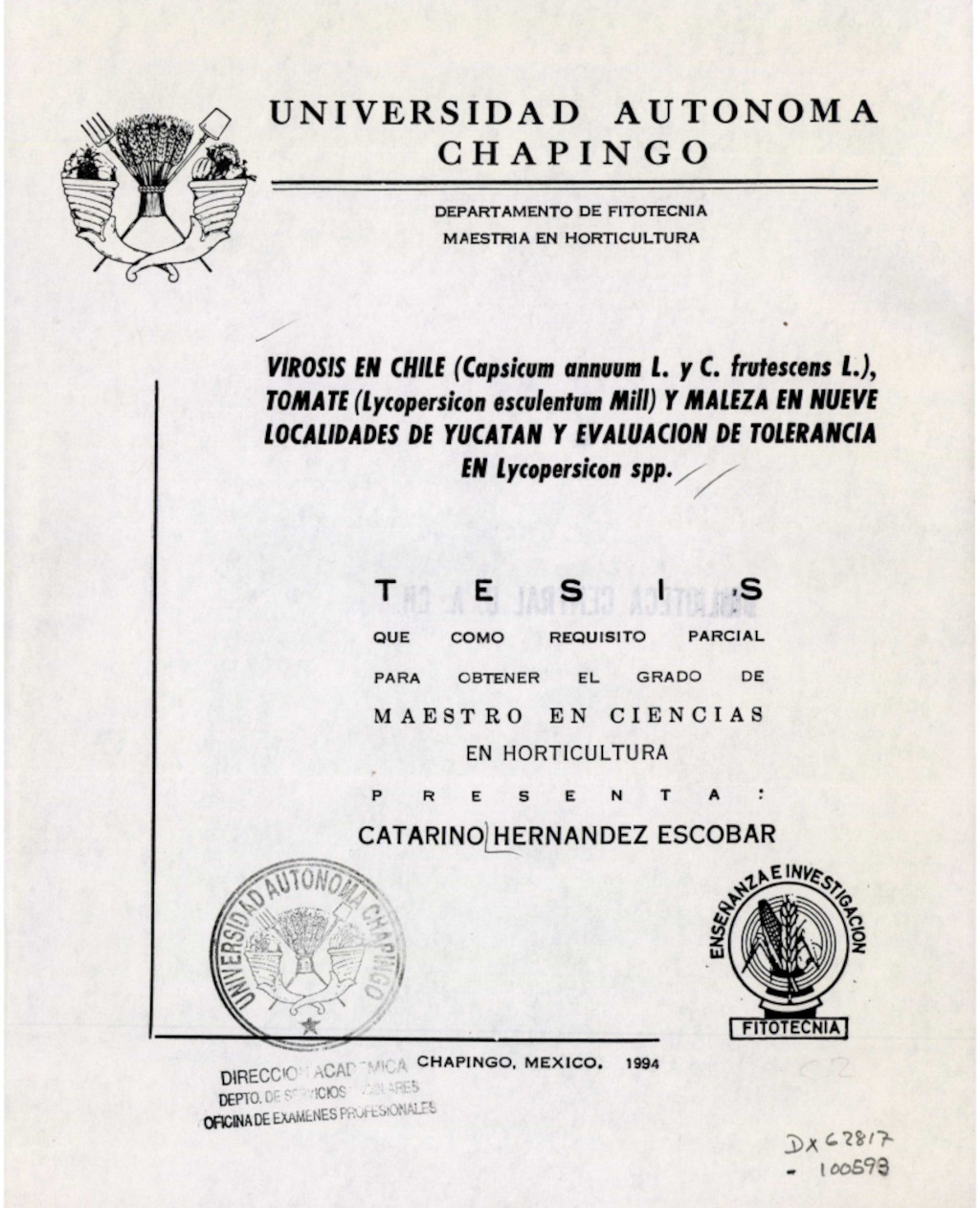 Virosis en chile (Capsicum annuum L. y C. frutescens L.), tomate (Lycopersicon esculentum Mill.) y maleza en nueve localidades de Yucatán y evaluación de tolerancia en Lycopersicon spp.