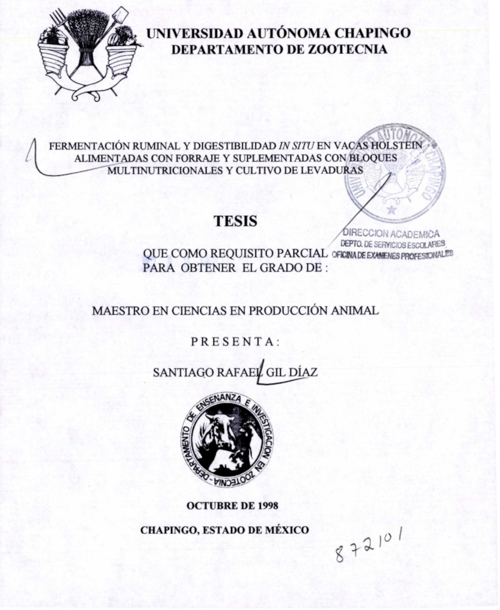 En un primer experimento se determinó el efecto de la temperatura (25, 40 y 55 °C) y tiempo de secado (24, 48, 72 y 96 h) en la dureza (kg.cm-2) de bloques multinutricionales (BMN) y en la viabilidad de un cultivo de levaduras (Yea-Sacc 1026®; YS); incluido en el BMN, usando como testigo BMN secados a la intemperie a intervalos de 10, 20 y 40 días. Se uso un diseño experimental completamente al azar con arreglo factorial 4x3 (tiempo x temperatura) y las medias fueron comparadas mediante la prueba de Tukey. La dureza de los BMN incrementó en función del tiempo y temperatura de secado, siendo similar a las 24, 48 y 72 h (P > .05) de secado y mayor (P < .05) a las 96 h. Respecto a la temperatura, la dureza fue similar (P > .05) a los 25 y 40 °C y superior (P < .05) a los 55 °C. Las UFC. g-1 del CL disminuyeron con el incremento de la temperatura, días al secado y días postelaboración. En un segundo experimento el efecto de adición de un 4% de YS en BMN, en el consume de MS, fermentación ruminal y digestibilidad in situ del forraje, se evaluó en cuatro vacas Holstein (600±95 kg PV) con cánula ruminal, las cuales fueron alojadas en corraletas individuales. Todas las vacas fueron alimentadas ad-libitum con una mezcla de: rastrojo de maíz (52%) y heno de alfalfa (48%) pero, según el tratamiento asignado se suplementaron con 10 g. d-1 de YS suministrado intraruminalmente (YS), con BMN sin YS (BMN YS), BMN con 4% de YS (BMN YS) o sÓlo forraje (T). El diseño experimental fue un Cuadrado Latino 4x4, el cual constó de cuatro periodos que comprendieron 10 días de adaptación y 5 de muestreo cada uno. Las medias de tratamientos se analizaron por contrastes ortogonales, los cuales fueron: BMN vs T, BMN vs YS y BMN YS vs BMN YS. La suplementación con BMN incremento (P < .05) la concentración de NH3 (mg.dl1) y AGV (mmol.L-1) respecto a T y YS; no obstante, la digestibilidad in situ de la materia seca (DISMS) y de la fibra detergente neutro (DISFDN) sólo la mejoró (P < .05) respecto a T pero no (P > .05) en comparación a YS a las 12 y 24 h postprandial. El BMN YS incrementós (P < .05) el consumo de MS, la concentración de AGV y la DISMS pero no (P > .05) de la DISFDN, en la relación al BMN YS. El pH dorsal del rumen fue menor (P < .05) en los animales suplementados con BMN YS en relación a aquellos alimentados con BMN YS . Se concluye que los BMN secados a 55 y 40 °C durante 48 y 96 h respectivamente, obtienen una dureza adecuada para ser proporcionados a los animales en menor tiempo, representado un ahorro en el fraguado entre 26 y 28 días. Los BMN mejoran las variables de fermentación ruminal en animales alimentados con forraje de baja calidad aunque estos sean inoculados con YS. Además los BMN mejoran su efecto si se les formula con el4% de YS.