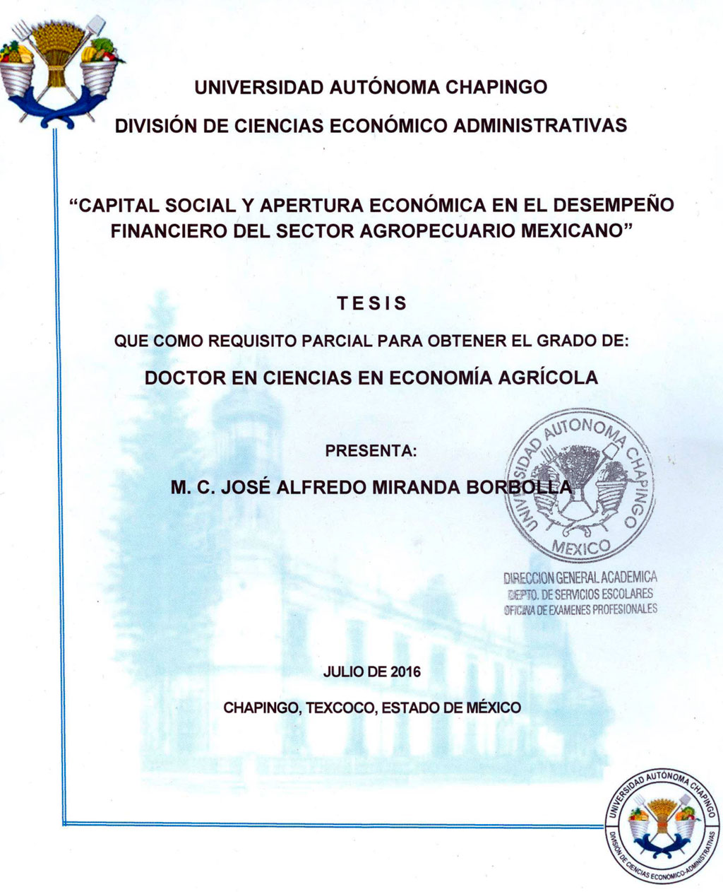 Tesis (Doctorado en Ciencias en Economía Agrícola)