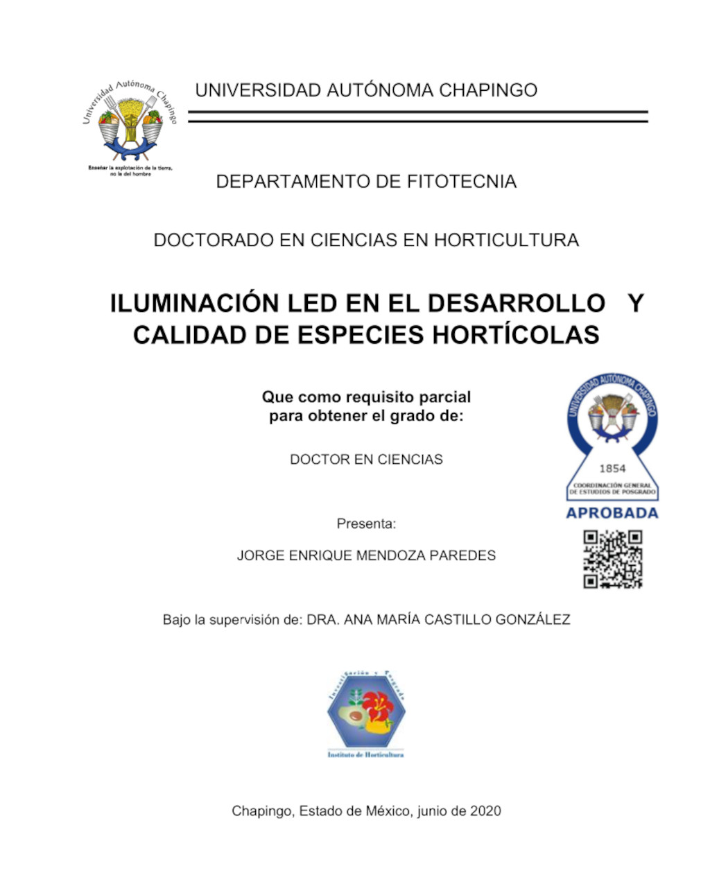El cilantro (Coriandrum sativum L.) es una planta con reconocidos usos culinarios y diversas propiedades medicinales, mientras el chile habanero (Capsicum chinense Jacq.) es el cultivo hortícola de mayor importancia económica en la península de Yucatán en México. Estas características las hacen ser adecuadas para cultivarse en ambiente controlado con iluminación LED y permitiría tener una producción continua, lo que a su vez daría como resultado un mayor rendimiento, y en un cultivo libre de plagas y enfermedades. Los objetivos fueron evaluar el efecto de cinco tratamientos con diferentes proporciones de luz LED azul(A):roja(R) y luz fluorescente (testigo), en condiciones controladas de crecimiento en plantas de cilantro, plántulas y plantas de chile habanero, en parámetros de crecimiento, concentración de pigmentos fotosintéticos y de nutrimentos en plantas de cilantro y de habanero. Además, se evaluaron compuestos fenólicos en hoja, germinación de polen, grosor de hoja, anatomía de ovario y antera en plantas de chile habanero. En cilantro se observó que una proporción azul:roja de A37.7 %:R62.3 % promovió el crecimiento y la concentración de pigmentos fotosintéticos, mientras una proporción de A57.7 %:R42.3 % promovió la concentración de nutrimentos en plantas. En plántula de habanero, el testigo promovió el crecimiento de hoja, mientras la luz azul promovió el desarrollo del tallo; los pigmentos fotosintéticos no tuvieron efectos estadísticos, excepto para la clorofila a. En planta de habanero, la luz azul indujo el crecimiento vegetativo y concentración de compuestos fenólicos, pero tuvo un efecto negativo en el rendimiento del fruto; la luz roja promovió la concentración de pigmentos fotosintéticos y rendimiento de fruto. La mayor y/o menor concentración de macronutrimentos se registró con luces monocromáticas azul y roja, respectivamente, mientras la mayor concentración de micronutrimentos se observó con una proporción de A34.5 %:R65.5 % y A100 %:R0 %. El testigo incrementó la germinación de polen y grosor de hoja. La anatomía de los óvulos en los ovarios y el polen en las anteras no presentaron ningún efecto de los tratamientos.