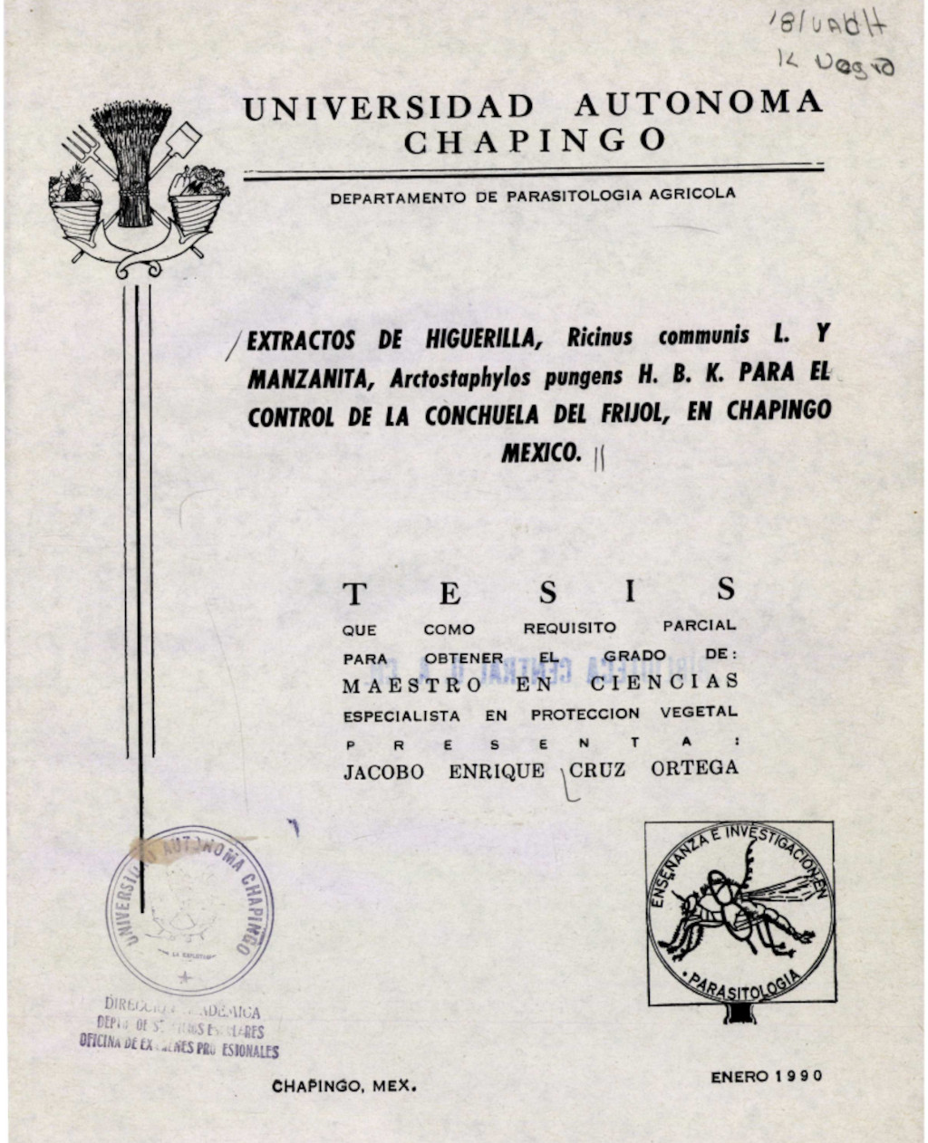 Extractos de higuerilla, Ricinus communis L. y manzanita, arctostaphylos pungens H. B. K. para el control de la conchuela del frijol, en Chapingo México