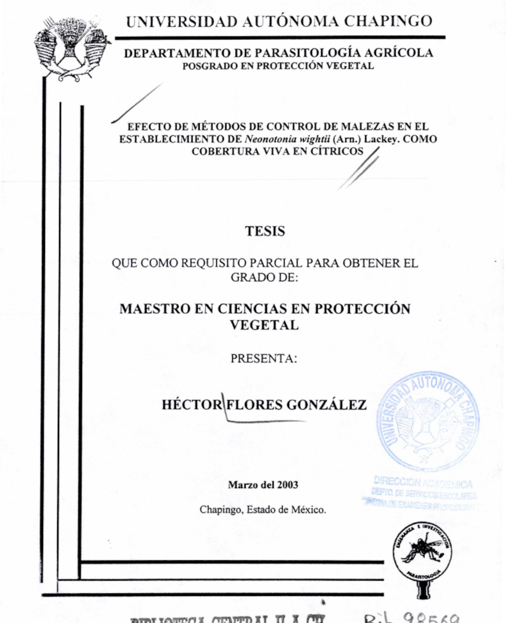 La investigación se estableció en Martínez de Ia Torre Veracruz, México, en una huerta de limón persa (Citrus latifolia Tan.) infestada con zacate Johnson (Sorghum halepense (L.) Pers.), durante 2001 y 2002. El objetivo fue evaluar el efecto de métodos convencionales de control de malezas (químico y corte manual) con Ia especie Mucuna pruriens (L.) DC. var. utilis (Wight) Burck como cobertura viva en el control de zacate Johnson para establecer permanentemente Neonotonia wightii (Arn.) Lackey, también como cobertura viva. El diseño fue de bloques completos al azar con 6 tratamientos y 4 repeticiones; Ia unidad experimental fue de 10 por 2 m, establecida en el centro de las hileras del limón. Los tratamientos fueron: cobertura de M. pruriens durante 6 meses; cobertura de M. pruriens durante un año con cosecha de Ia semilla; cobertura de M. pruriens durante un año sin cosecha de semilla; corte mensual durante un año; corte trimestral durante un año y control químico trimestral con glifosato durante un año usando 1.2 kg. de i.a. ha-1. Las variables evaluadas fueron peso fresco y seco de Ia parte aérea y de rizomas de S. halepense y peso fresco y seco de Ia parte aérea de otras malezas. Se determino el peso fresco y seco de M. pruriens, porcentaje de emergencia, así como el porcentaje de cobertura y producción de semilla. Se evaluó Ia densidad de plántulas y el peso de Ia cobertura de Neonotonia wightii. Los resultados mostraron una disminución en el peso de Ia parte aérea y rizomas de S. halepense, después de 6 meses de establecimiento del experimento en los tratamientos con cobertura y corte mensual. Los tratamientos a base de corte, mensual y químico disminuyeron Ia población de zacate Johnson, propiciando Ia emergencia de otras especies de malezas. No existió diferencia estadística entre tratamientos en Ia densidad de plántulas de N. wightii pero los mejores tratamientos para establecer N. wightii fueron: cobertura durante 6 meses y durante un año. Se puede utilizar Ia cobertura viva como herramienta efectiva en el control de malezas sin distinción del metodo de control químico y control con corte mensual.