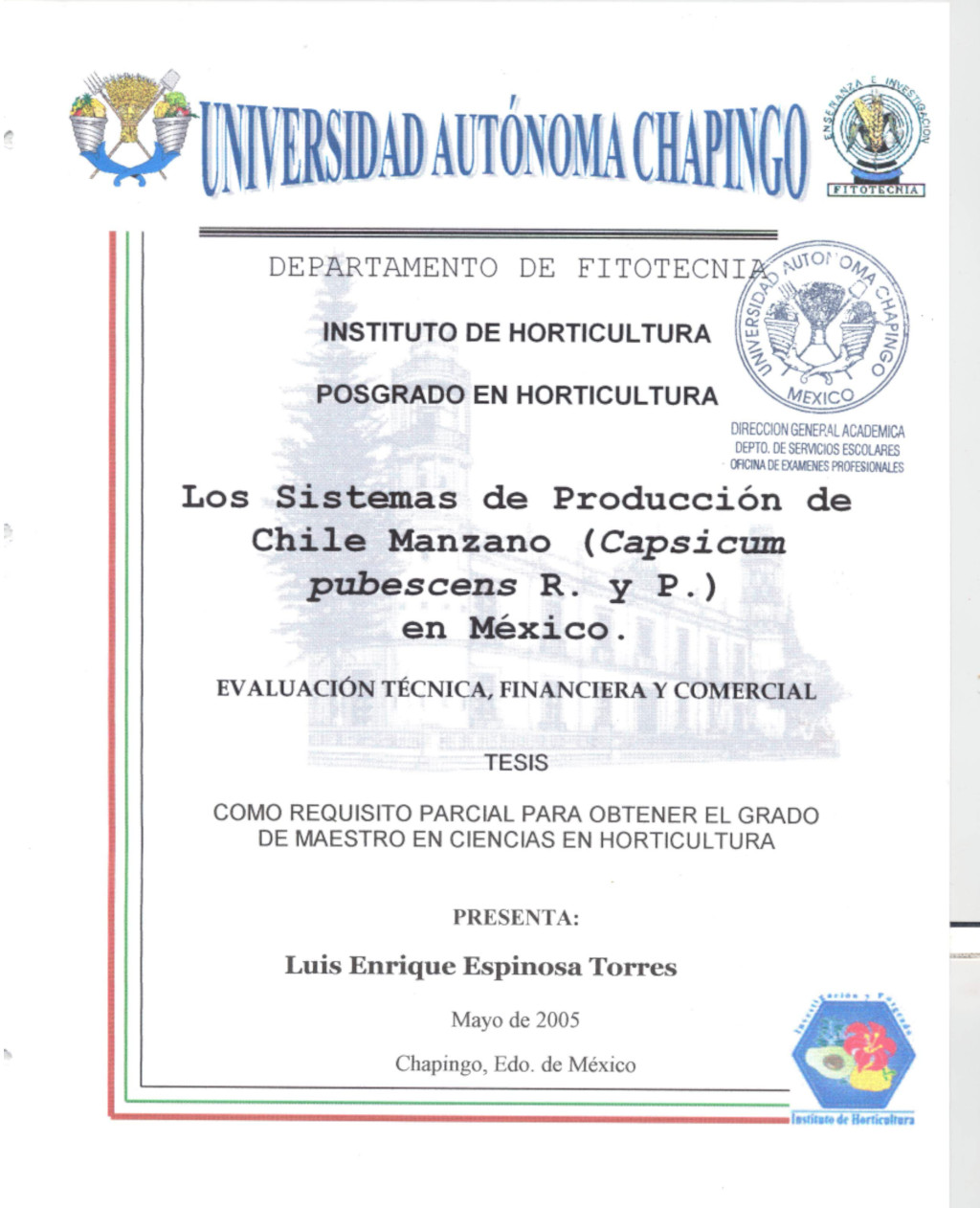 Los sistemas de producción de chile man/ano (Capsicum pubescens R. y P.) en México son de campo abierto bajo sombra de árboles de pino y con frutales de temporal y el intensivo en hidroponía bajo condiciones de invernadero. Estos sistemas presentan diferencias significativas en los aspectos técnico, financiero y comercial como consecuencia de las innovaciones tecnológicas y por el grado de inversión de capital. En el aspecto técnico el sistema más eficiente es el intensivo bajo condiciones de invernadero, ya que permite un control más adecuado de los factores ambientales (Temperatura, Humedad Relativa, Radiación), incidencia de plagas, enfermedades y polinización, Además, la vida productiva del cultivo es mayor y se obtienen rendimientos elevados en pequeñas superficies. Los indicadores financieros considerados señalan que los sistemas evaluados fueron económicamente rentables. Sin embargo, la producción en invernadero resulta aun más viable, aun cuando la inversión es más elevada. También se prevé que a corto y mediano plazo los sistemas de campo abierto presentarán problemas técnicos y edáficos que provocarán la no rentabilidad del cultivo. Comercialmente el chile manzano producido en cualquier sistema no presenta problemas para su venta en mercados regionales y nacionales. Pero en los mercados internacionales, la calidad de los frutos es un factor determinante para el consumidor. En este sentido el producto de invernadero es superior al de campo, teniendo una ventaja comparativa y competitiva. Por otra parte, se detectó que los agentes que intervienen en la comercialización del chile manzano limitan la participación del productor en el precio de venta final.