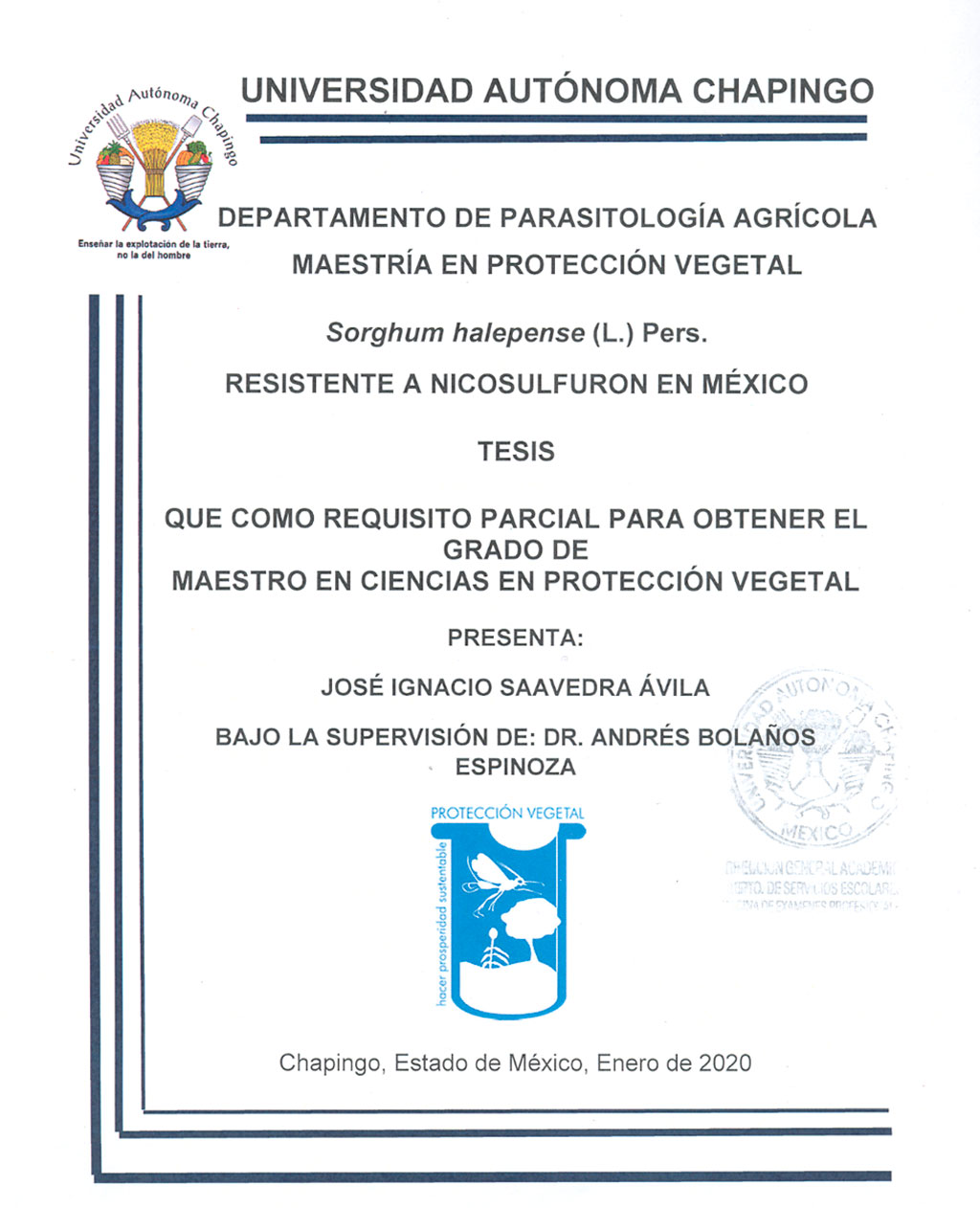 Sorghum halepense es una de las peores malezas del mundo, se reproduce por medio de semillas y rizomas, siendo extremadamente agresiva y difícil de controlar en maíz, cultivo base de la alimentación mexicana. El control químico es común para su control; sin embargo, el uso de un mismo ingrediente activo puede traer consigo la resistencia a herbicidas. Se realizaron tres estudios; el primero acerca de los tratamientos pre-germinativos para la ruptura de la dormancia de semillas de Sorghum spp. (Sorghum halepense, Sorghum bicolor), en el que se evaluaron 11 tratamientos. El mejor método fue la escarificación manual, potenciando su germinación en un 64.73%, respecto al testigo absoluto. El segundo estudio consistió en realizar ensayos preliminares de resistencia en biotipos de Sorghum spp. a herbicidas inhibidores de la ALS, EPSPS y 4-HPPD. Los resultados mostraron una alta susceptibilidad en todos los biotipos al herbicida glifosato (EPSPS) a dosis de 2.0 y 4.0 L ha-1; todas las poblaciones de Sorghum spp. exhibieron tolerancia a topramezone (4-HPPD) a dosis de (100 y 200 mL ha-1) .Los biotipos de Sorghum halepense B7, B4 y B13 presentaron las menores reducciones de su peso de materia fresca, con respecto a sus testigos, contrario a ello el biotipo 17 fue el que exhibió la mayor reducción del peso de materia verde, en su dosis de 2.5 L ha-1 de nicosulfuron (Sulfoniurea-ALS). Se concluye realizar los ensayos generales de dosis respuesta con los biotipos B7, B4 y B13 con sospecha de resistencia y el biotipo 17 como susceptible. El tercer estudio se centró en realizar bioensayos de dosis-respuesta y dilucidar el mecanismo de resistencia en los biotipos B4 (Oro verde), B7 (El Marcial), B13 (Francisco Villa) y B17 (Comonfort). Los resultados mostraron resistencia a nicosulfuron en los biotipos Oro verde, El Marcial y Francisco villa, siendo 69, 34 y 92 más resistentes que el biotipo susceptible (Comonfort). Los tres biotipos resistentes mostraron un cambio de bases en los nucleótidos GAT a GGA, lo que resultó en una sustitución del aminoácido Asp (ácido aspártico) a Glu (ácido glutámico) en la posición 376 del gen ALS. Hasta donde se tiene información este es primer caso en México con esta mutación en esta especie, que otorga resistencia a nicosulfuron.