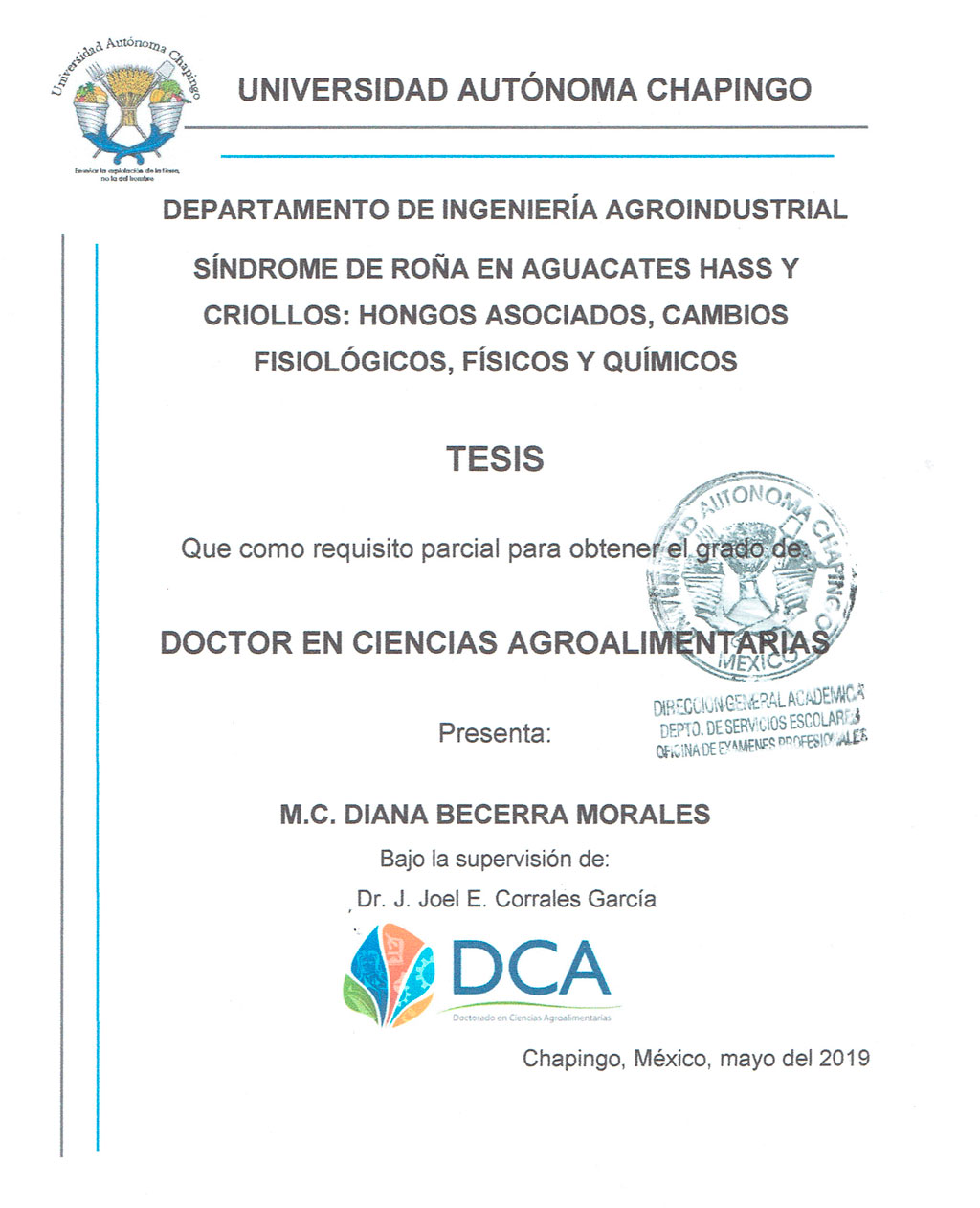 El aguacate (Persea americana Mill.) es uno de los cultivos más importantes en México, ya que es el principal productor y exportador a nivel mundial. La roña es considerada como una de las enfermedades fúngicas de mayor importancia económica para este cultivo. Se manifiesta con lesiones de apariencia corchosa y sólo se presentan en el pericarpio de los frutos sin afectar a la pulpa. Se reportó en 1934 a Sphaceloma perseae como agente causal de esta enfermedad, sin embargo, hasta la fecha no existe información científica que corrobore este hecho, poniendo en duda al patógeno responsable. Por lo que el objetivo principal de esta investigación fue la identificación de los patógenos asociados a la roña en aguacates ‘Hass’ y criollo. Se utilizó una combinación de técnicas de identificación basada en marcadores moleculares (PCR-RFLPs) y se realizaron pruebas de patogenicidad in vivo para poder determinar al patógeno causal de la roña. Las características físicas y químicas de los aguacates y los cambios fisiológicos de los frutos infectados fueron evaluadas. Se obtuvieron 31 aislamientos fúngicos provenientes de aguacates con roña de dos regiones geográficas distintas de México. Mediante el análisis morfológico y molecular se identificaron especies de Alternaria sp. Colletotrichum sp., Phoma sp., Pestalotiopsis sp., Artrhinium sp., y Penicillium sp. asociadas a síntomas de roña. Se observaron alteraciones en la tasa de respiración y producción de etileno, y se incrementó el contenido de fenoles en los frutos de aguacate como respuesta al ataque de estos patógenos. Se observó mayor susceptibilidad del ‘Hass’ ante la infección de patógenos fúngicos comparado con el aguacate criollo mexicano, esto pude atribuirse al alto contenido de antocianinas en la cáscara de los criollos. Pruebas de patogenicidad en campo fueron negativas al síntoma de roña. Ninguno de los hongos identificados fue S. perseae.