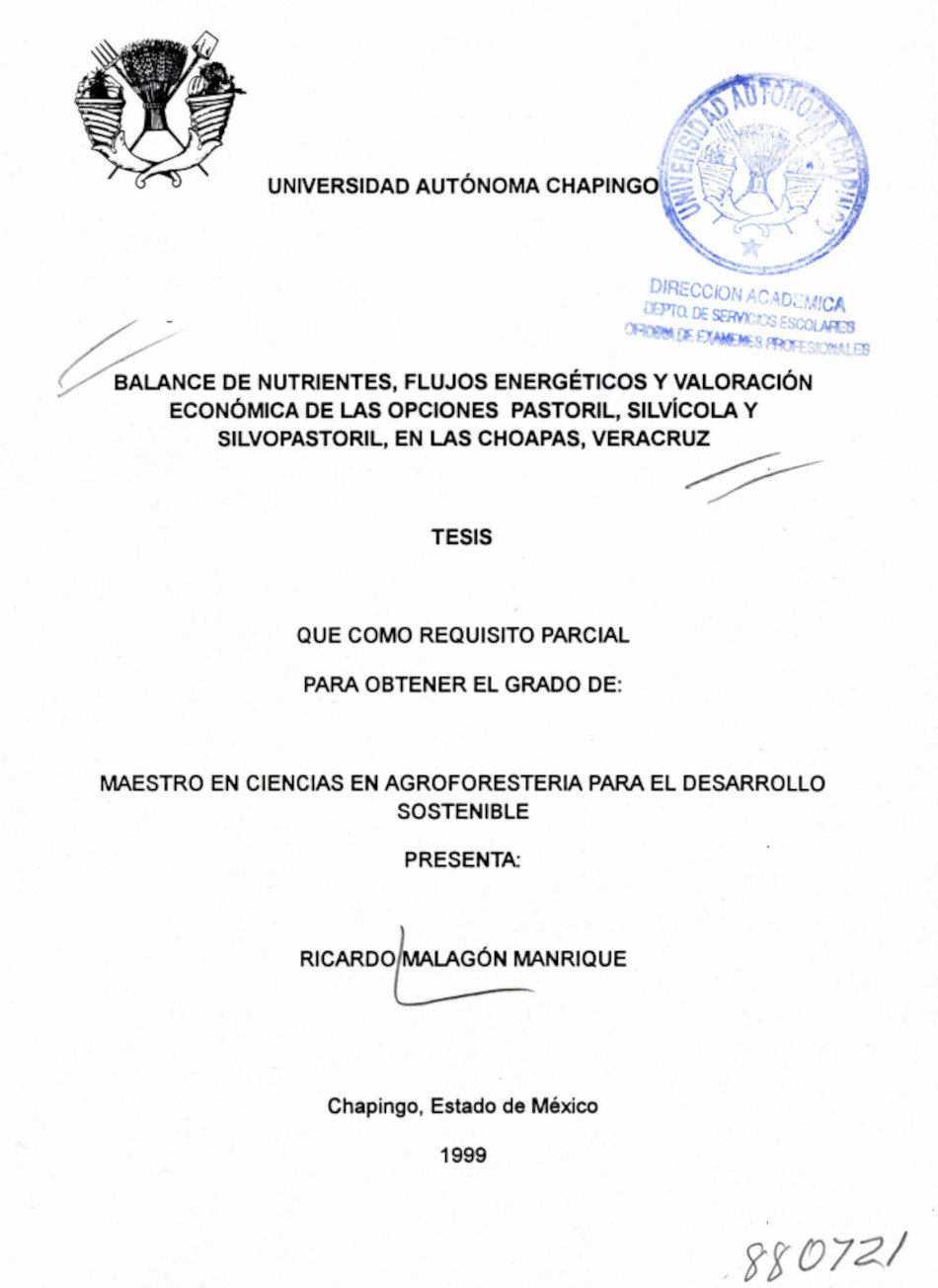 Balance de nutrientes, flujos energéticos y valoración económica de las opciones pastoril, silvícola y silvopastoril, en las Choapas, Veracruz