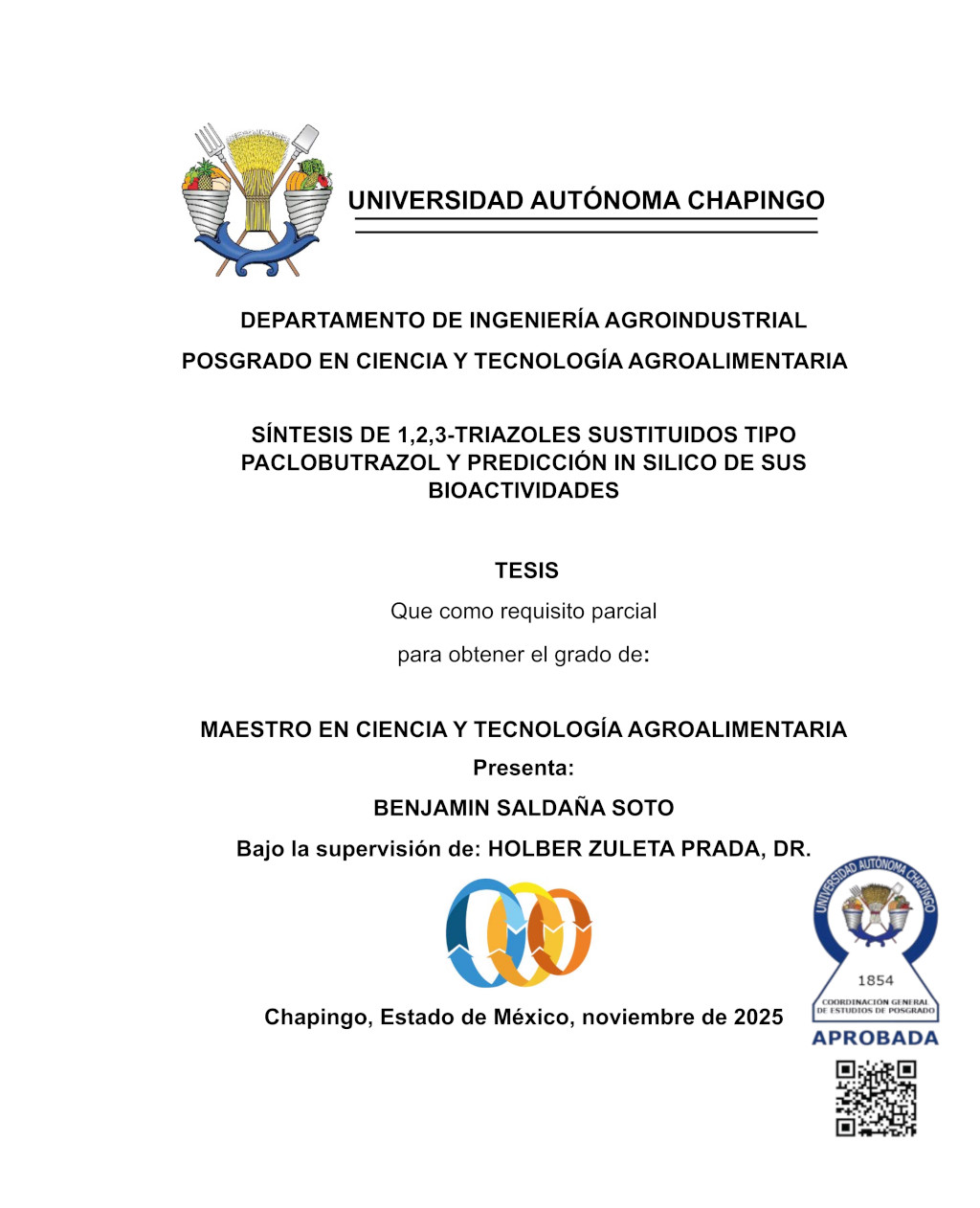 Los triazoles y sus derivados son compuestos de gran relevancia debido a sus destacadas propiedades biológicas, que incluyen actividad antimicrobiana, herbicida y antifúngica, así como su capacidad para regular el crecimiento vegetal. Como fungicidas y reguladores del crecimiento, estos agroquímicos representan una alternativa económica para combatir enfermedades de las plantas causadas por hongos patógenos, que afectan la calidad y el rendimiento de los alimentos a nivel global. Por esta razón, los triazoles constituyen estructuras químicas de gran interés para el desarrollo de nuevos agroquímicos. Actualmente, la combinación de métodos experimentales y enfoques computacionales se ha consolidado como una estrategia eficaz para el diseño y la síntesis de nuevos compuestos con potencial bioactivo para la protección de cultivos. En esta investigación se sintetizaron 45 nuevos 1,2,3-triazoles sustituidos, obteniendo buenos rendimientos mediante la reacción “Click” entre una azidopinacolona y alquinos. De los productos finales, 15 fueron clasificados como análogos de paclobutrazol, caracterizados mediante espectroscopía infrarroja y resonancia magnética nuclear. Paralelamente, se construyó un modelo de relaciones cuantitativas estructura–actividad basado en datos experimentales extraídos de ChEMBL para predecir la actividad antifúngica; 6E y 7E resultaron los más prometedores. El acoplamiento molecular indicó que los compuestos 6H, 6I y 6K mostraron afinidades superiores a las de difenoconazol y paclobutrazol para las dianas de CYP51 de Fusarium oxysporum y de la proteína ent-kaureno oxidasa. Finalmente, la evaluación de absorción, distribución, metabolismo y excreción mediante SwissADME permitió descartar estructuras poco viables y desarrollar un índice de priorización que consideró la afinidad, las propiedades fisicoquímicas y la facilidad de síntesis. Los resultados obtenidos respaldan el potencial de estos triazoles como base para el desarrollo de nuevos agroquímicos.