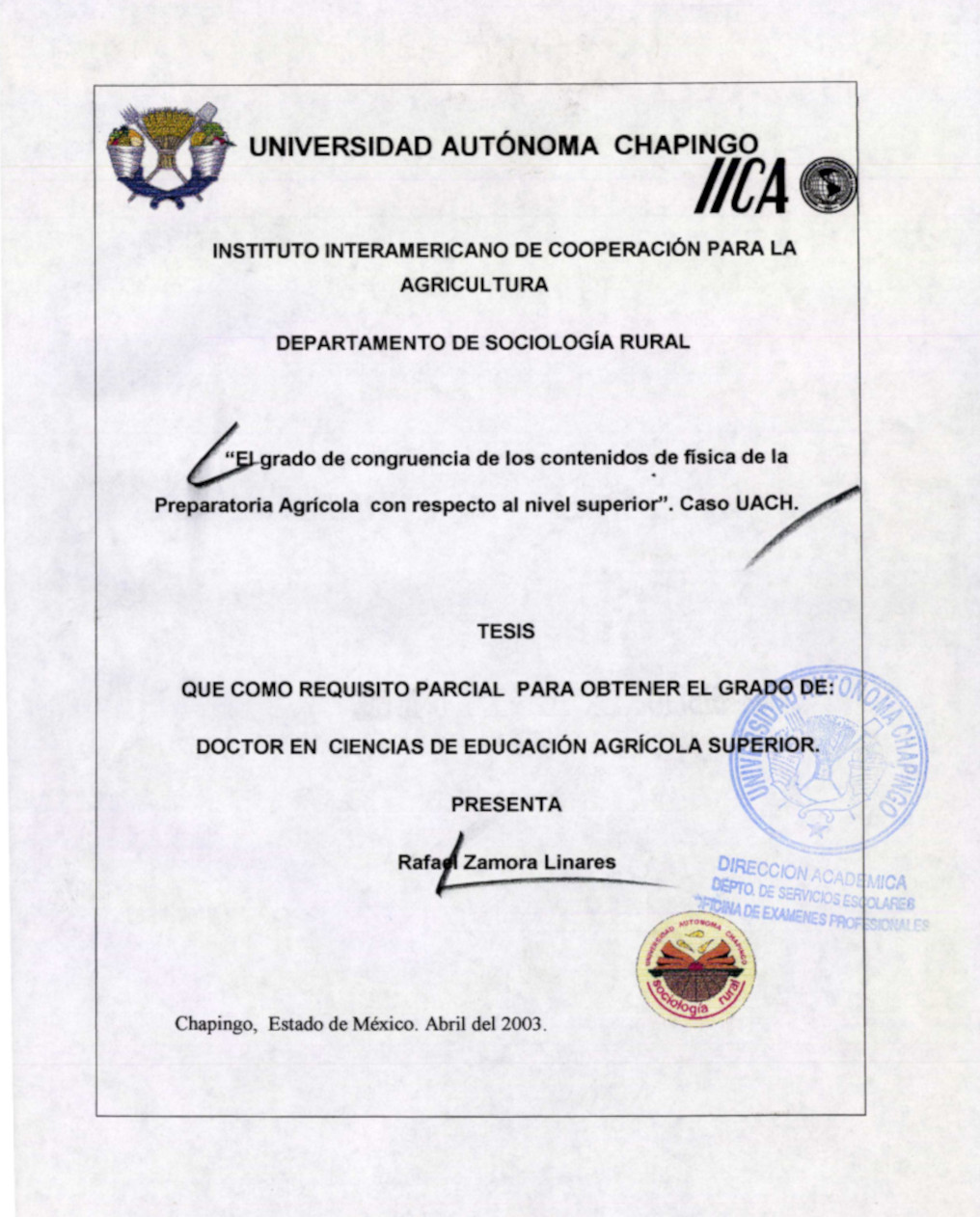 El grado de congruencia de los contenidos de física de Ia Preparatoria Agrícola con respecto al nivel superior''. Caso UACh