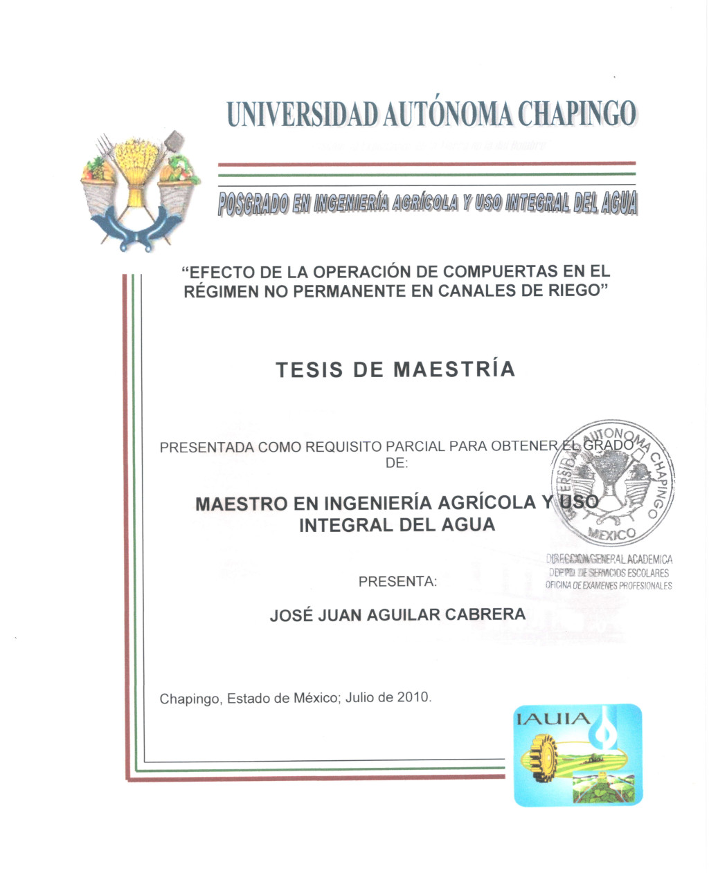 Tesis (Maestría en Ingeniería Agrícola y Uso Integral del Agua)