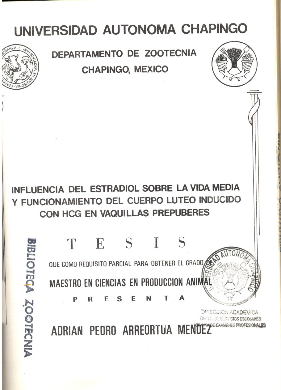 Con el objetivo de estudiar si el incremento en las concentraciones de estradiol observado 3 <5 4 días antes de la ovulación tiene una función en la formación de cuerpos lúteos de vida media normal inducidos con gonadotropina coriónica humana (hCG), se realizó un experimento con 31 vaquillas de las razas Holstein (n= 12), Angus (n= 8) y Suizo Pardo (n= 12), cuando las vaquillas pesaron 200.5+3.75 kg, se asignaron al azar dentro de genotipo, a uno de cuatro tratamientos. En el primer tratamiento (n=8) las vaquillas fueron tratadas con 1000 U.I. de hCG para inducir cuerpos lúteos de vida corta, considerado testigo negativo (hCG). En el segundo tratamiento (n=7, NORG) los animales recibieron un implante de 6 mg de norgestomet por 9 días; 48 horas después recibieron 1000 U.I. de hCG y este fue el testigo positivo; después de la remoción del implante recibieron 1000 U. I. de hCG, y fué disenado para formar cuerpos lúteos de vida media normal. En el tercer tratamiento (n=8) se aplicó 150 ug de Benzoato de Estradiol (E2) dos veces al dia por 4 dias, 12 horas después de la última aplicación de estradiol las vaquillas se inyectaron con 1000 U.I. de hCG. En el cuarto tratamiento (n=8) se aplicaron dosis ascendentes de estradiol (EA;100, 150, 200, 250, 300, 350 y 400 /¿g ) cada 12 horas durante 4 dias, y doce horas después de la última inyección se administró 1000 U.I. de hCG. Para determinar las características del cuerpo diariamente por 22 días iniciándose al momento de la aplicación de hCG. Los análisis estadísticos se hicieron por pruebas de ji cuadrada y análisis de varianza para un diseño de bloques al azar, donde la raza se consideró como bloque. El número de vaquillas que ovuló en respuesta a la administración de hCG fué menor en aquellos animales tratados con estradiol ( 25 y 37.5 % para E2 y EA respectivamente), comparado con aquellos animales en NORG (57.14 %) o tratadas solo con hCG (75 %). La vida media del cuerpo lúteo fue de: 9.5+1.2, 19.0±1.6, 4.0±2.25 y 5.0±1.83 para hCG, NORG, E2 y EA respectivamente (P <0.05). Se sugiere que los incrementos en estradiol observados antes de la ovulación, no mejoran por sí solos , la vida media del cuerpo lúteo; por el contrario, los resultados del presente experimento indican que la administración de estradiol antes de la ovulación causa una reducción en la vida inedia del cuerpo lúteo.
