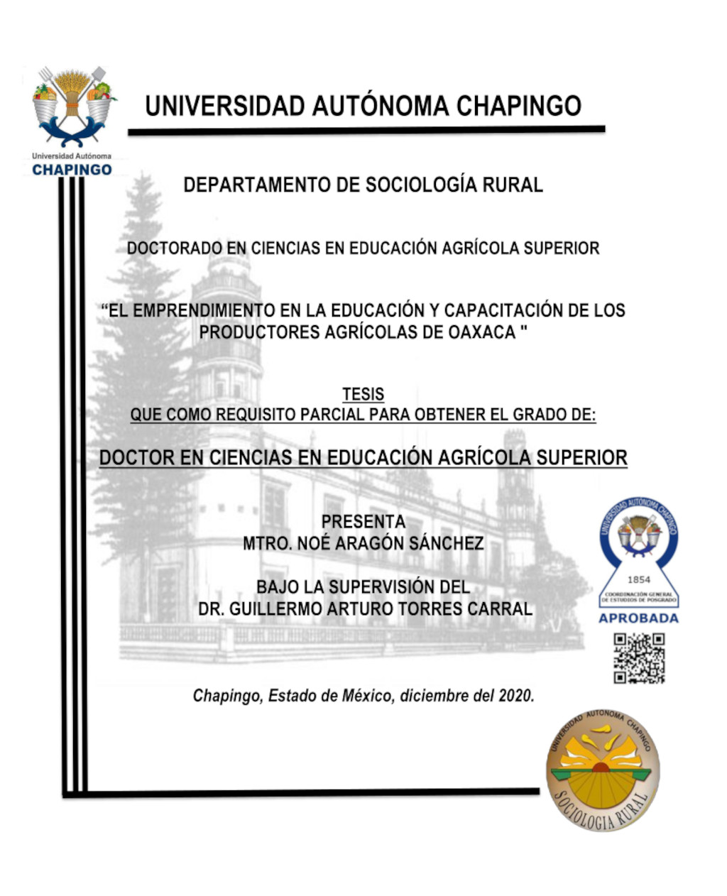 La presente tesis es el producto de la integración y análisis de tres capítulos como artículos de investigación, centrados sobre los temas del emprendimiento, de la educación y modelo educativo en México y la capacitación a través de la educación para los productores agrícolas, en particular los campesinos de la región de valles centrales del estado de Oaxaca. En el primer capítulo se analizó con la metodología de la quíntuple hélice y la interrelación de los cinco elementos que la integran, los cuales son, el elemento educativo, económico, el entorno natural, social (cultura e información) y entorno político, para el óptimo desarrollo socioeconómico de los sujetos y ambiente de estudio. En el segundo capítulo se analiza la estructura y pertinencia del modelo educativo y la educación en los niveles básico y media superior definida por el estado mexicano a través de la Secretaria de Educación y su funcionalidad en la oferta educativa del estado de Oaxaca. Y en el capítulo tres se analizó la experiencia de los productores agrícolas del estado de Oaxaca, en su emprendimiento a través de la comercialización y transformación de su producción, así como la influencia de la educación y capacitación, en su trabajo y desarrollo socioeconómico. Luego del análisis de los tres capítulos y artículos correspondientes se encuentra que la educación, capacitación y diseño curricular dirigido, son determinantes para el éxito, el desarrollo y el mejoramiento de las condiciones de vida de la sociedad armonizando eficientemente los siguientes elementos: Educación, Economía, Entorno Natural, Sociedad, y Entorno Político.