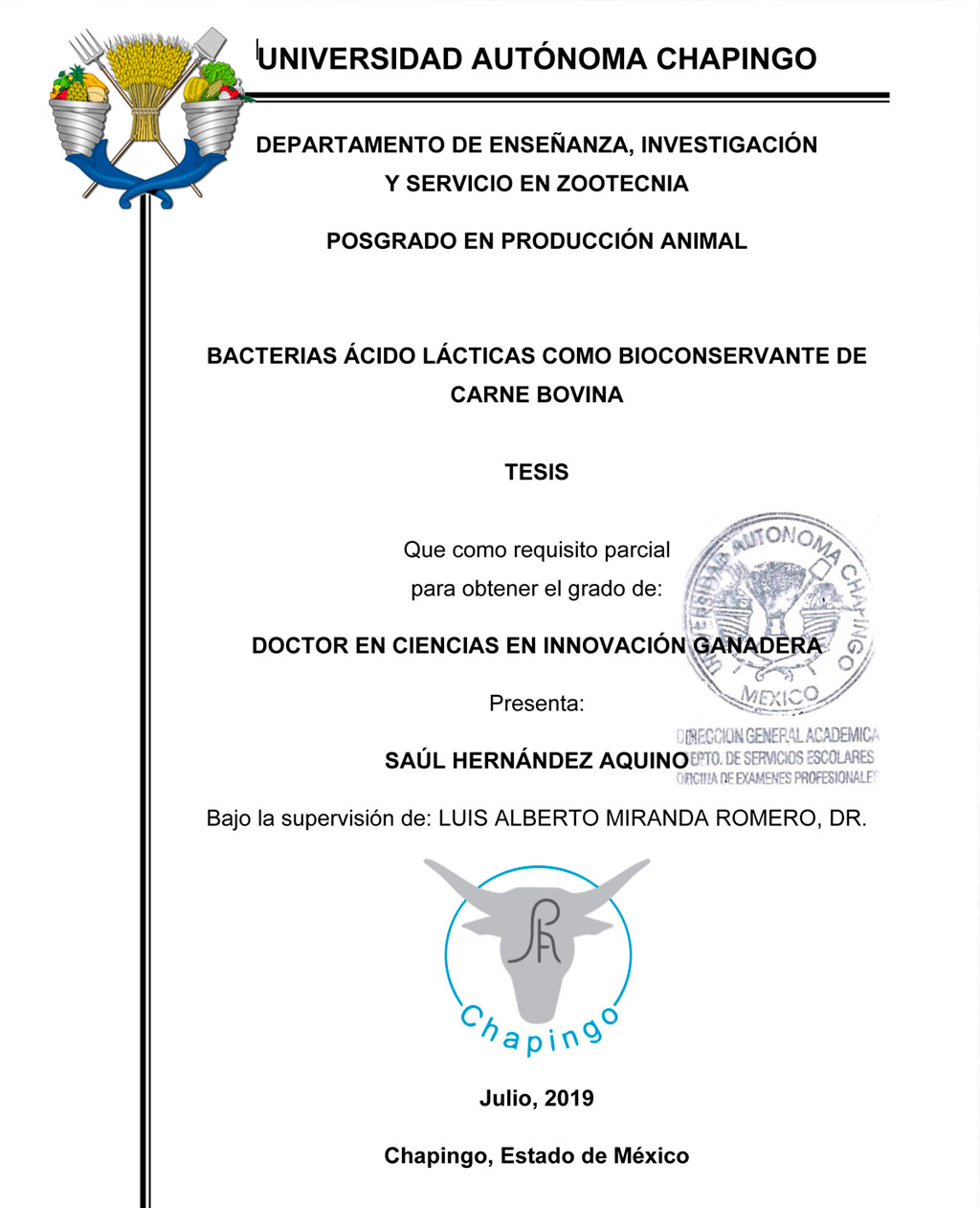 La carne es un alimento que por su rico contenido en nutrientes (grasa, proteína, minerales y agua) es fácilmente colonizada por microorganismos. Un mal procesamiento higiénico durante la cadena productiva favorece la contaminación bacteriana lo que resulta en la reducción de la vida útil de los productos cárnicos. Los métodos alternativos como la bio-conservación buscan aumentar la vida útil y reducir el contenido de bacterias patógenas. Por lo que el objetivo de este estudio fue obtener bacterias acido lácticas (LAB) nativas de carne capaces de inhibir el crecimiento de bacterias patógenas. Para esto se aislaron 115 LAB de carne molida de res de diferentes puntos de venta de la ciudad de Texcoco; de las cuales 44 LAB presentaron antagonismo hacia las bacterias de referencia (Salmonella y E. coli) por el ensayo spot on the lawn. Cinco aislados de LAB, así como su sobrenadante libre de células (CFS) presentaron antagonismo hacia ambas bacterias de referencia, dichas bacterias se identificaron por el sistema API50ch. Posteriormente se usaron los cultivos y los CFS de las LAB con efecto inhibitorio más significativo (Lactobacillus delbrueckii y Lactococcus lactis) para reducir la población de las bacterias de referencia en carne molida de res a temperatura de refrigeración; los cultivos bacterianos presentaron mayor efecto reductivos después del cuarto día, mientras que el CFS redujo la población desde el primer día, aunque el efecto se redujo posteriormente. L. lactis y su CFS presentaron mayor efecto reductivo en comparación con Lb. delbrueckii. Se concluyó que las cepas de Lb. delbrueckii y L. lactis seleccionadas tienen potencial para utilizarse como bioconservadores que ayuden en la inhibición y reducción de la población de Salmonella y E. coli contaminante en carne molida de res, y su CFS puede ser utilizado como tratamiento de desinfección alternativo o complementario.