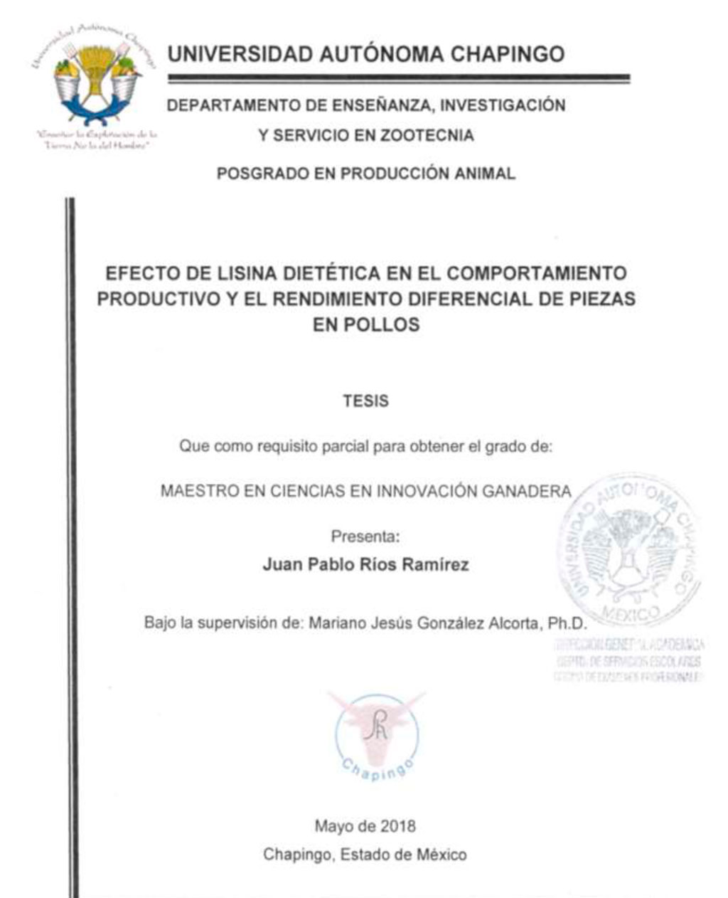 Para evaluar el comportamiento productivo y rendimiento diferencial de pechuga, pierna y muslo de pollos de engorda por efecto de lisina dietetica. Se establecieron cuatro tratamientos (Ti) con tres repeticiones, en un diseño completamente al azar (Yij= μ + Ti + Eij), con dos fases de alimentación (1-22 y 23-45 días de edad). Las dietas fueron isoenergéticas e isoproteicas y se formularon con cuatro niveles de lisina (1.10, 1.20, 1.30 y 1.40, y 0.95, 1.05, 1.15 y 1.25 %) para cada fase de alimentación, respectivamente. Las hipótesis principales son que el nivel dietético de lisina mejora las variables del comportamiento productivo, peso y rendimiento de piezas de pollo de engorda. Las variables analizadas fueron: consumo de alimento (C), ganancia de peso (GP), conversión alimenticia (CA); pesos vivo (PV), al sacrificio (PS), pechuga (Ppe), pierna y muslo (Ppm), y alas (Pal), y rendimientos de pechuga (Rpe), pierna y muslo (Rpm), y alas (Ral). Las variables de respuesta fueron similares entre tratamientos (P>0.05) en la fase de 1 a 22 días. En la fase de 23 a 45 días, el C y CA fueron similares (P>0.05); sin embargo, el PV (2822b, 2883ab, 2983ab, 3021a g) incrementó (P≤0.05) a partir del nivel 1.05% de lisina dietética, a su vez el RPe (27.41b, 28.18ab, 29.42a, 28.27ab %) incrementó mientras el Rpm (25.28a, 24.78ab, 23.79bc, 23.37c %) disminuyó (P≤0.05). En conclusión, los niveles de lisina en las dietas de pollos de engorda despúes de los 22 días mejoran algunas variables del comportamiento productivo, peso y rendimiento de piezas de la canal. Además los niveles crecientes de lisina afectan en forma inversa a los rendimientos de pechuga en relación a los de pierna y muslo.