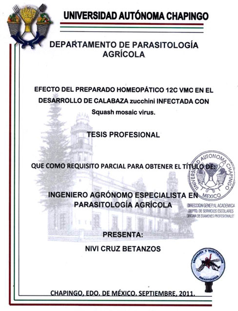 La necesidad de probar alternativas que sirvan para el manejo de las enfermedades virales en los cultivos agrícolas ha llevado a desarrollar investigación en el área de la homeopatía, por lo que en este trabajo se propuso evaluar el producto homeopático 12C VMC, elaborado a partir de follaje de calabaza infectado y con síntomas del Squash mosaic virus (SqMV), el cual se aplicó a plantas de calabaza Cucurbita pepo variedad zucchini de 10 y 13 d, antes, después y antes-después de la infección mecánica del SqMV, comparándose con dos testigos, con y sin virus. Estos tratamientos conformaron un diseño experimental completamente al azar, con cuatro y cinco repeticiones para plantas de 10 y 13 d, en condiciones de invernadero. A los 40 d después de la última aplicación del preparado homeopático se registró el peso fresco de la planta, área foliar de la hoja del tercer nudo descendente, longitud de raíz, número de botones florales y densidad óptica de la savia. Los resultados demuestran que el producto homeopático 12C VMC aplicado sobre plantas de calabaza de 10 y 13 d de edad, en pre, post y pre-post inoculación del SqMV, afecta la ganancia de peso fresco de la planta, el desarrollo del área foliar y la producción de botones florales. El crecimiento de la raíz es normal con los tratamientos pre y pre-post inoculación en plantas de 10 d; se inhibe en todas las plantas de 13 d; y se estimula con la aplicación post inoculación. La densidad óptica no se afecta con la aplicación pre inoculación, pero se disminuye con post inoculación, hasta inhibir en 73.3% el desarrollo del virus. Este porcentaje, hace posible que el uso de productos homeopáticos se apliquen para el manejo de enfermedades, ya sea incrementando la dosis o el número de aplicaciones.