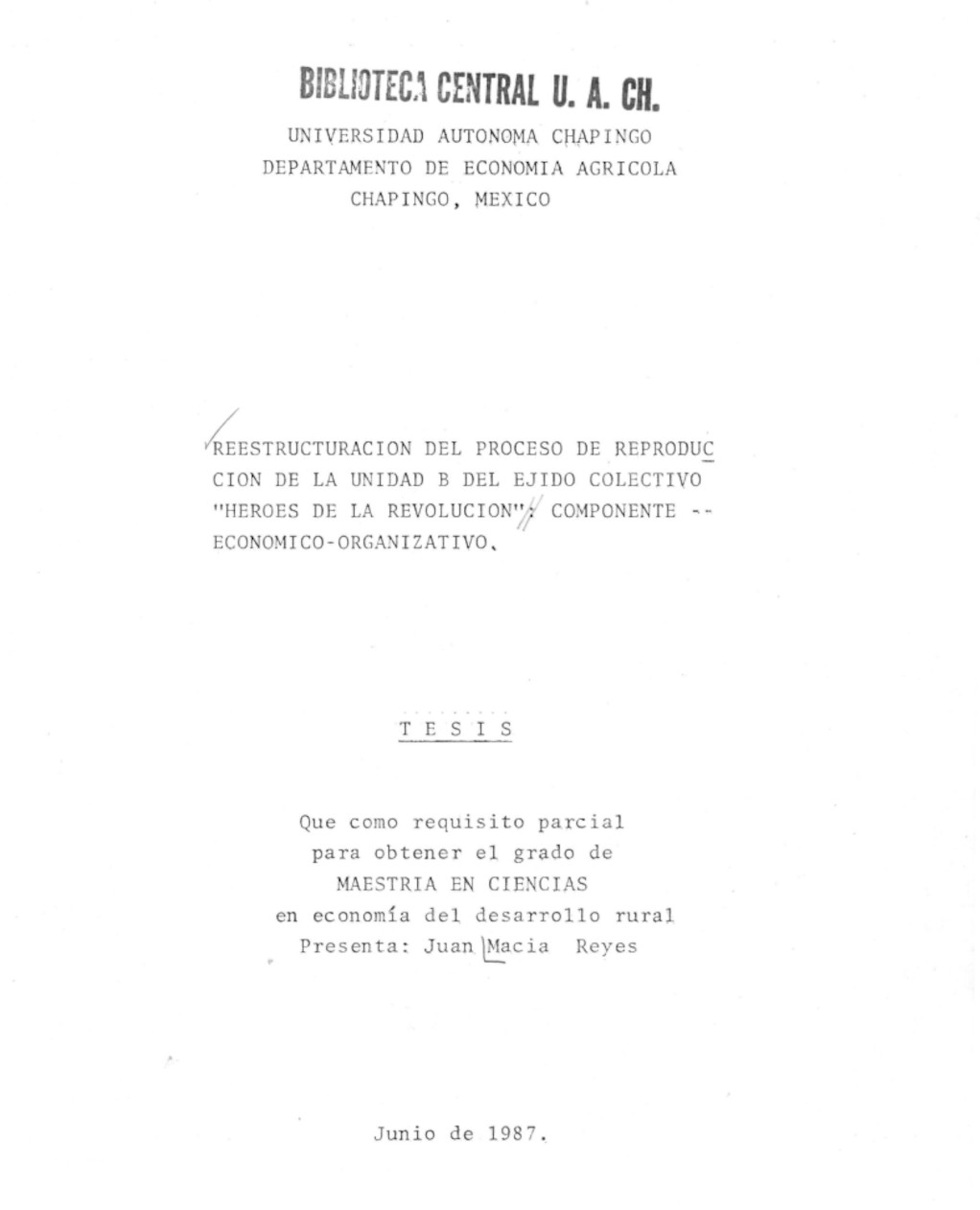 Reestructuración del proceso de reproducción de la unidad B del ejido colectivo "Héroes de la Revolución": componente económico-organizativo