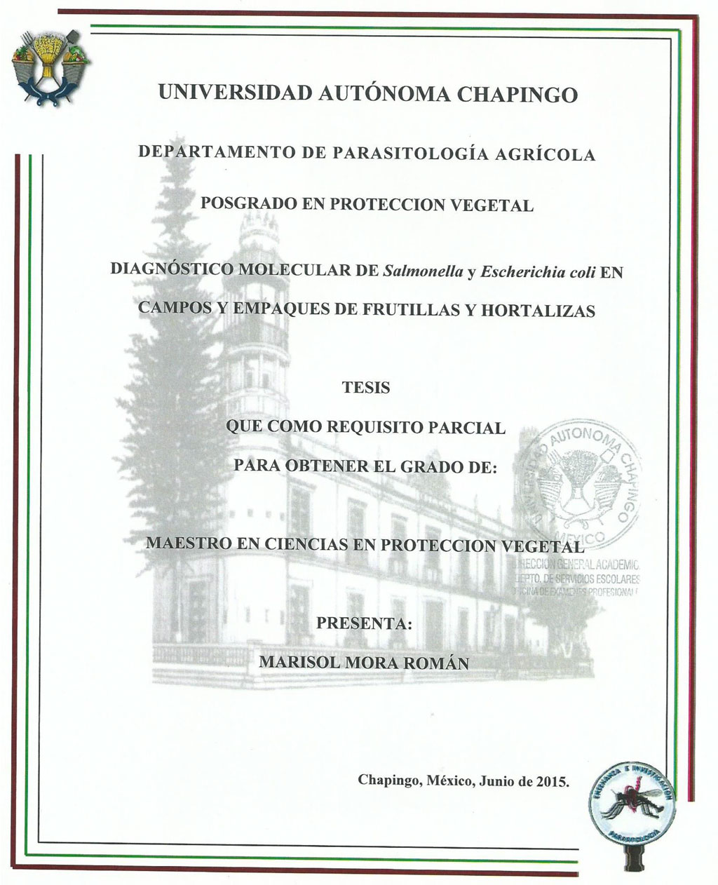 La inocuidad de los alimentos constituye un requisito básico para los consumidores. Salmonella y Escherichia coli (E. coli) se han visto implicadas en brotes de enfermedades por el consumo de frutas y hortalizas frescas esto ha afectado lazos comerciales y cierres de fronteras. Con el objetivo de identificar especies de Salmonella y E. coli cultural y molecularmente, presentes en heces fecales de animales domésticos y silvestres; en agua para la aplicación de insumos de protección vegetal, riego, y agua para el lavado de manos en las unidades de producción y empaques de frutillas y hortalizas en los estados de Michoacán, Guanajuato y Colima, se realizaron dos muestreos de acuerdo a los procedimientos de la NOM 014-SSA1-1993. Las muestras fueron tomadas de agua (pozos, membranas y tinas), y heces fecales de animales; estas se llevaron al laboratorio para aislarlas en medio Mac Conkey (MCA); después se realizó la extracción de DNA, y la amplificación los fragmentos de DNA de los genes 16S, invA y toxina Shiga, posteriormente se hicieron agrupaciones de bacterias por RFLPs. Se detectó a E. coli en un 64% y a Salmonella en un 50% del total de muestras aisladas en medio MCA; Los resultados de los RFLPs demostraron que el 11% de total de las muestras pertenece a Salmonella y el 31%. E.coli.
