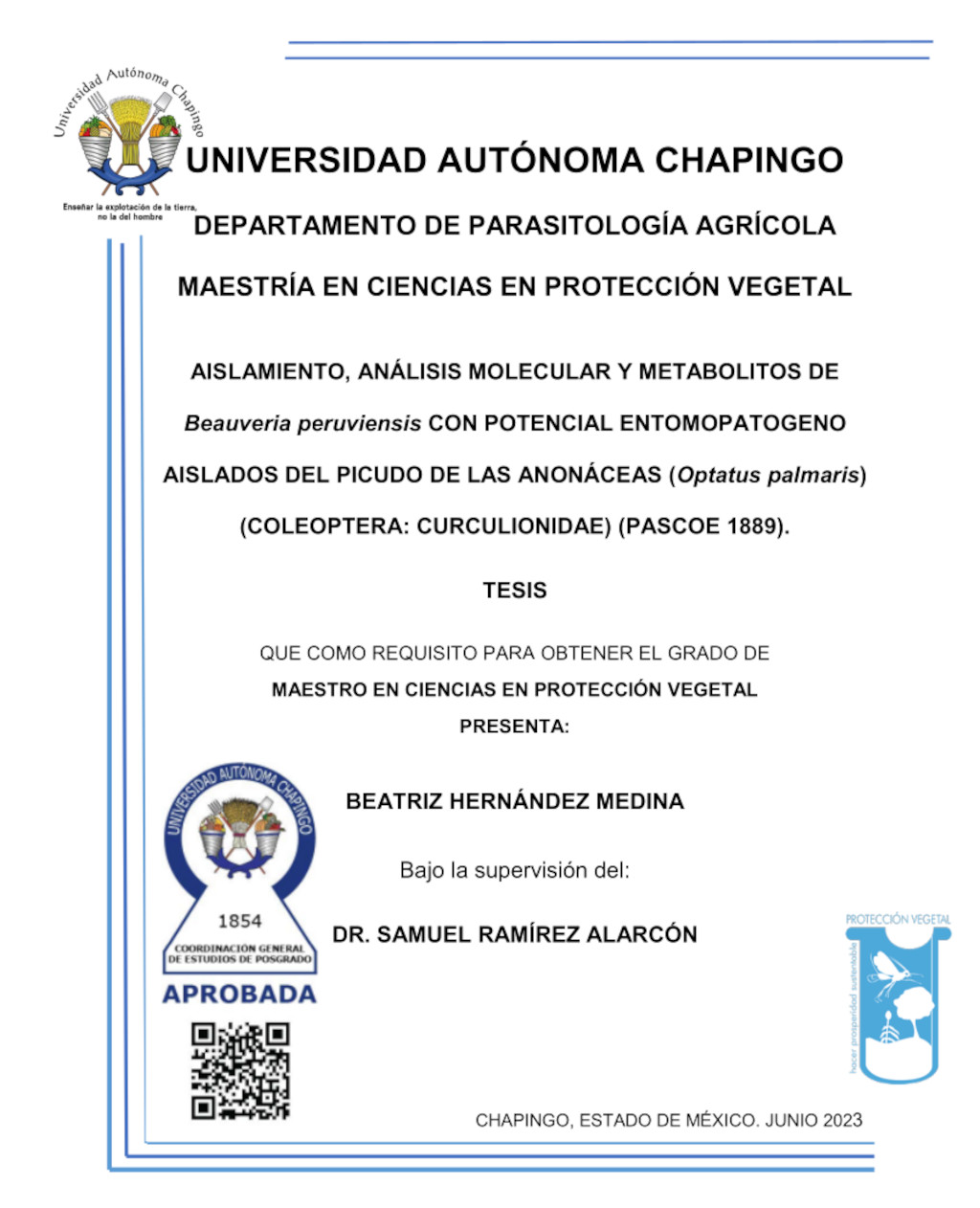 Aislamiento, análisis molecular y metabolitos de Beauveria peruviensis con potencial entomopatogeno aislados del picudo de las anonáceas (Optatus palmaris) (coleoptera: curculionidae) (pascoe 1889)