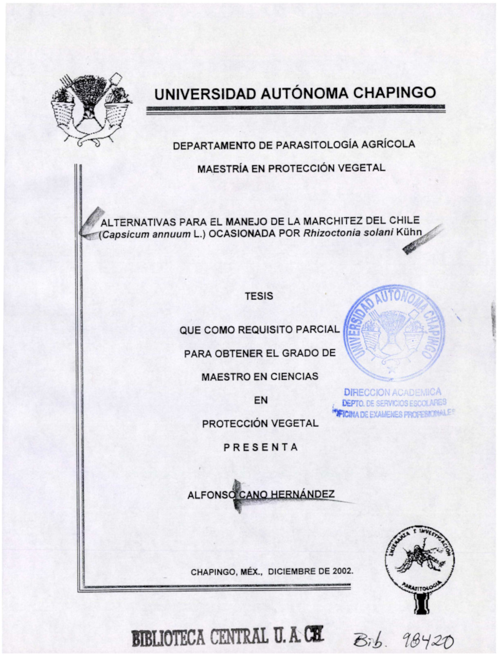 | dc.title | Alternativas para el manejo de la marchitez del chile (Capsicum annuum L.) ocasionada por Rhizoctonia solani Kühn | |