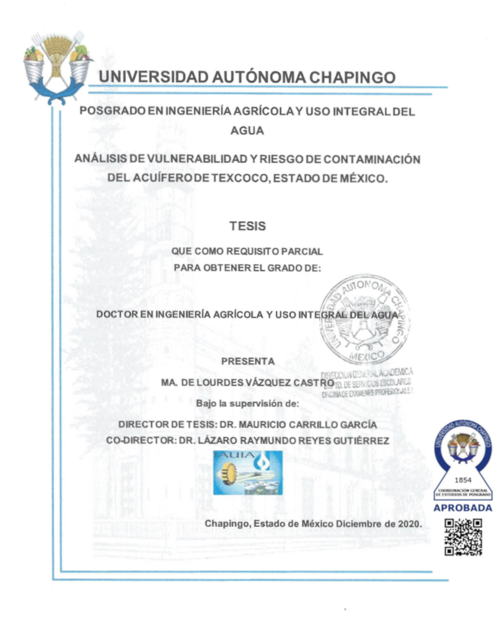 México, enfrenta problemas de disponibilidad de agua y contaminación, los cuales se agravan por el consumo y uso desmedido de este recurso natural. El agua subterránea presenta una gran cantidad de problemas debido al descenso continuo de sus niveles y en algunos sectores del acuífero existe un riesgo elevado a la contaminación, impactando de manera negativa el suministro de este recurso. De esto deriva la importancia de la gestión y manejo sustentable de este recurso hídrico. El acuífero de Texcoco es el principal recurso de agua de al menos 13 municipios en la parte oriente del Valle de México, es la principal fuente de abastecimiento de una población cercana a los 3,200,000 habitantes. El crecimiento económico de una región, así como el bienestar de la población depende fuertemente de la posibilidad de alcanzar un manejo sustentable. El objetivo de este trabajo fue determinar el riesgo de contaminación del agua subterránea, generando y analizando mapas de riesgo con base a los parámetros de Dar Zarrouk y el método AVI. La vulnerabilidad intrínseca se determinó con base a variables que caracterizan al acuífero en estudio como; profundidad del nivel del agua, litología, tipo de acuífero, topografía, características de la zona no saturada y su conductividad hidráulica saturada. La información para el desarrollo de esta metodología se adquirió a través de mediciones en campo y recopilación de datos, abarcando la superficie del terreno, correspondiente al área estudio. El mapa de vulnerabilidad y riesgo a la contaminación se elaboró con base a las zonas susceptibles de infiltración, a partir de datos de la conductividad hidráulica, Kfs (m∙d-1) y espesor h (m) de la zona no saturada, se obtuvieron valores de la resistencia hidráulica C=1.4 a 3.9 días, que muestran un cierto grado de vulnerabilidad, la cual se clasifico conforme a los niveles del modelo.