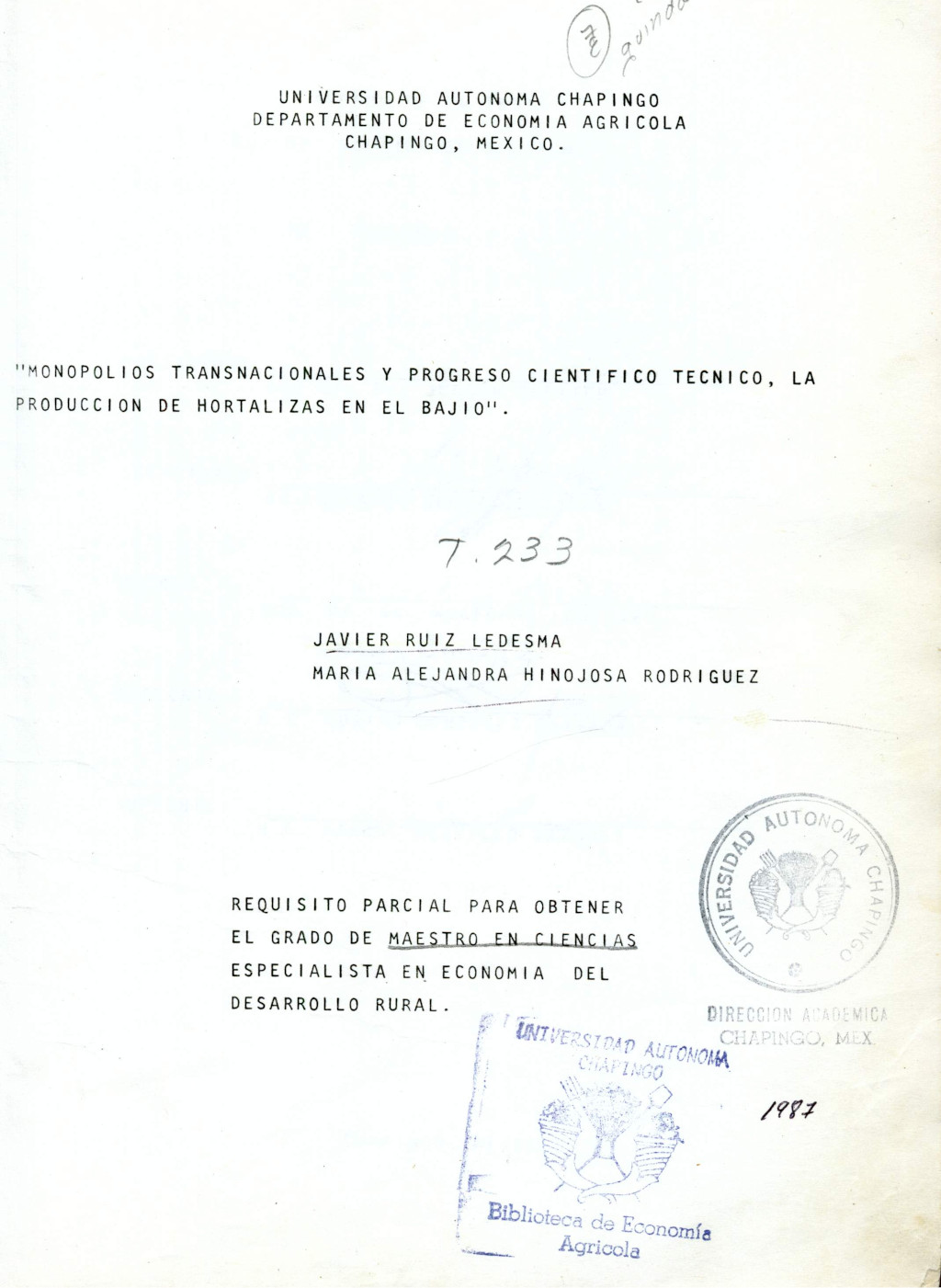 Tesis (Maestría de Ciencias en Economía Agrícola y de los Recursos Naturales)