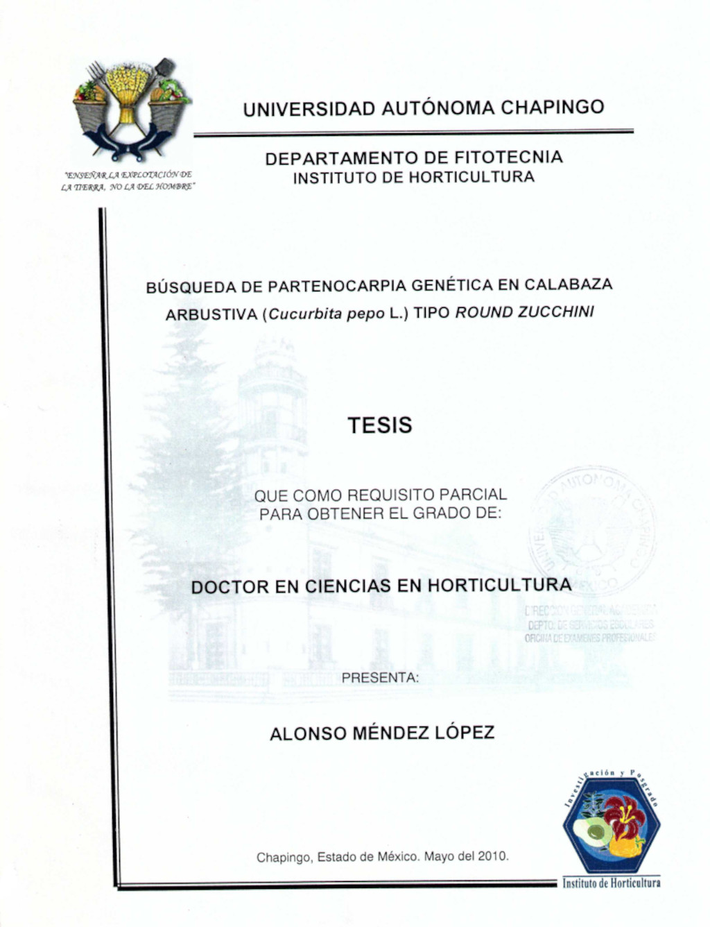 "Este estudio se desarrolló en la Universidad Autónoma Chapingo (UACh), con el objetivo de buscar, localizar y caracterizar morfológica y molecularmente (RAPO Microsatélites y RAMP) genotipos arbustivos partenocárpicos de calabaza (Cucurbita pepo L.) tipo round zucchini. El material genético base de esta investigación fue una población de amplia base genética proveniente de la libre recombinación de las progenies de cruzamientos dialélicos con el método IV