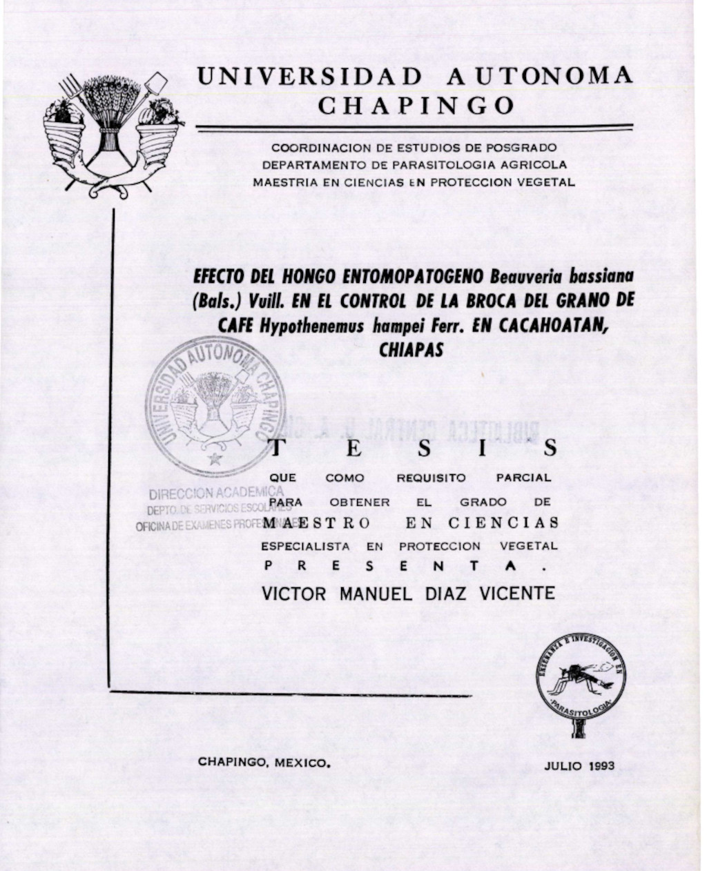 Efecto del hongo entomopatógeno Beuveria bassiana (Bals.) Vuill. En el control de la broca del grano de café Hypothenemus hampei Ferr. En Cacahoatan, Chiapas