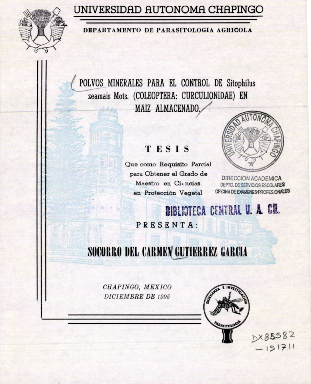 El maíz está expuesto al ataque de insectos en el campo de cultivo, y después en el almacén. De aquí Ia necesidad de guardarlo en almacenes o depósitos que presenten las condiciones adecuadas para conservar sano el grana, para su posterior consumo. Una de las plagas que causan grandes pérdidas a este cultivo es el gorgojo del maíz, Sitophilus zeamais Mots., para el cual se han buscado métodos de combate como: físico, biológico, genético y químico; así como por media de polvos vegetales y minerales no tóxicos. Con base en lo anterior, se probaron dos polvos minerales en cinco híbridos de maíz para los Valles Centrales de México, con los objetivos siguientes: 1) evaluar el porcentaje de mortalidad de S. zeamais causado por dos polvos minerales en maíz almacenado y 2) determinar si Ia estructura y características intrínsecas del grana de maíz tienen influencia complementaria con Ia efectividad de los polvos minerales para el control de S. zeamais. Para tal fin se analizaron las siguientes variables: tipo de grano, densidad del grano, índice de flotación, contenido de fenoles, numero de insectos vivos (NIV), numero de insectos muertos (NIM), numero de insectos emergidos (NIE), numero de granos sanos (NGS), numero de granos variados (NGD), peso del grano sano (PGS) y peso del grana dañado (PGD). En base a los resultados se llegó a las siguientes conclusiones: 1) el polvo mineral diatomea presentó resultados similares al malatión y 2) Ia dureza del grano y los ácidos fenólicos proporcionan resistencia al grano de maíz a Ia infestación por S. zeamais.