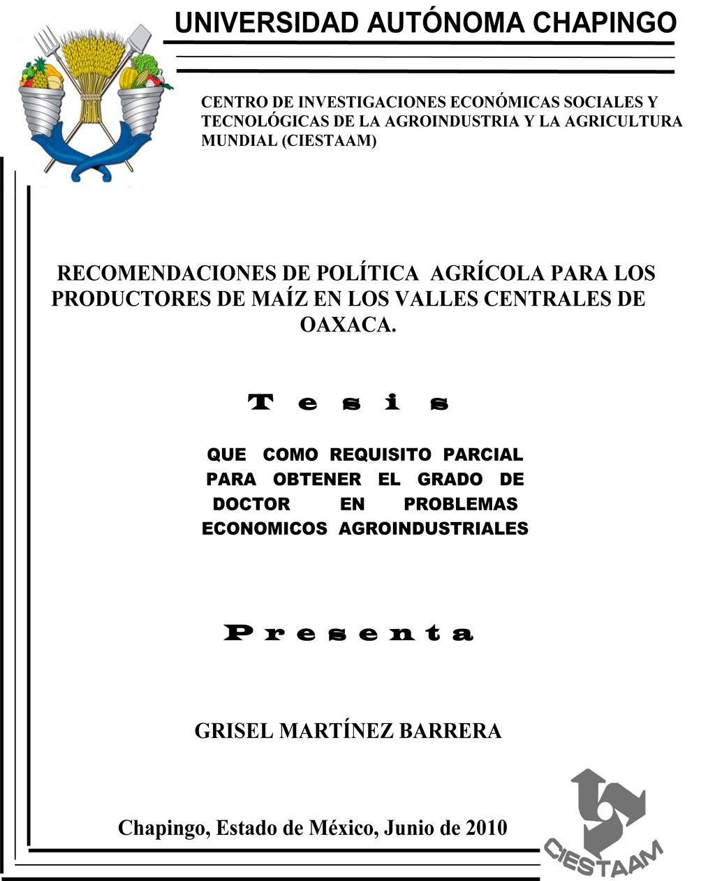 Recomendaciones de Política Agrícola para los productores de maíz en los Valles Centrales de Oaxaca.