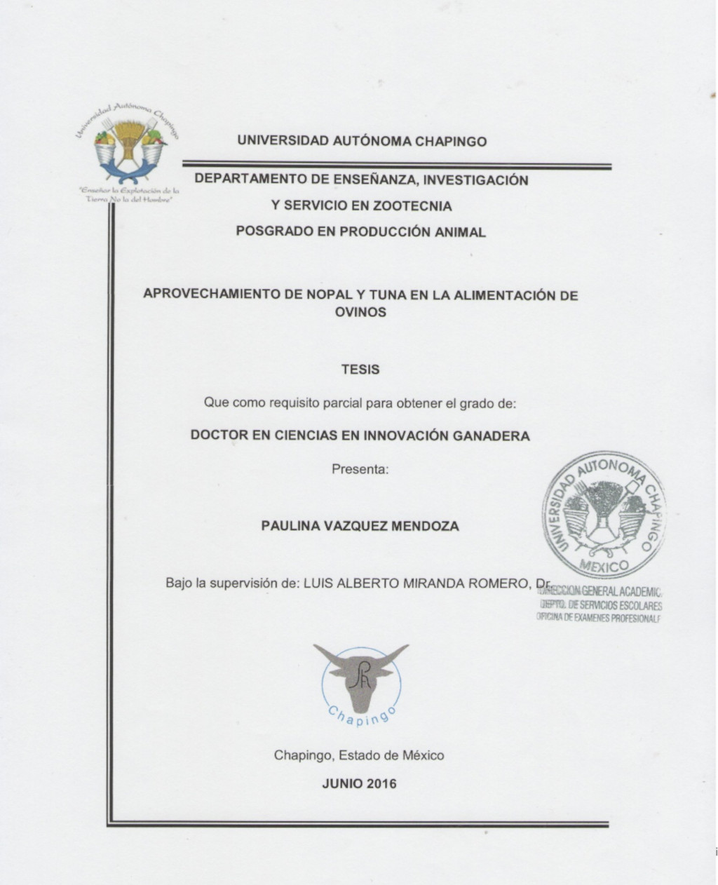 Una práctica agrícola común en los sistemas de producción intensiva de nopal y tuna, es la poda de cladodios. Éstos junto con la tuna que no se comercializa, podrían ser utilizados como alimento alternativo para rumiantes. Sin embargo, para utilizarlos de forma apropiada es necesario conocer su aporte nutrimental, la asimilación ruminal y el desempeño productivo de rumiantes que los consuman. El Capítulo 1 de este documento presenta una revisión de literatura de la composición nutrimental del nopal, su inclusión en dietas y efecto en el comportamiento productivo de ovinos y caprinos. La revisión mostro variabilidad en la composición nutrimental del nopal con respecto a la edad, cultivar y manejo del cultivo, observándose resultados favorables respecto al desempeño productivo de ovinos y caprinos. En los Capítulos 2 y 3 se muestran resultados de composición química, fermentación ruminal y digestibilidad in vitro de cladodios maduros de once cultivares de nopal y de tres cultivares de tuna. La composición química de cladodios y tunas varió entre cultivares. La digestibilidad de cladodios y tunas fue superior a 80 %, por lo que ambos pueden utilizarse como ingrediente alimenticio en la dieta de ovinos. En el Capítulo 4 se presenta un estudio del efecto de la inclusión de ensilados de nopal y nopal-tuna, en el aporte de nutrientes, fermentación y digestibilidad in vitro, así como en el consumo y digestibilidad aparente en ovinos. El aporte de nutrientes fue similar para las dietas formuladas con ensilados de nopal y nopal-tuna vs una dieta convencional. No hubo diferencia (P>0.05) en el consumo y digestibilidad aparente por ovinos. Se concluyó que es factible la inclusión de ensilados de nopal y nopal-tuna en dietas para ovinos. Sin embargo, debido a la variabilidad en el contenido de nutrimentos, fermentación y digestibilidad in vitro entre cultivares, es necesario caracterizarlos antes de incluirlos en la dieta para ovinos. El capítulo 5 muestra resultados sobre la morfología de nopal forrajero cv Miúda (Nopalea cochenillifera Salm Dyck) en diferentes sistemas de cultivo en el agreste de Pernambuco, Brasil. Las características morfológicas de los cladodios de nopal forrajero cv Miúda son afectadas escasamente por la fertilización con urea. Sin embargo, la fertilización con estiércol bovino incrementa la anchura, longitud y el índice del área de cladodio.