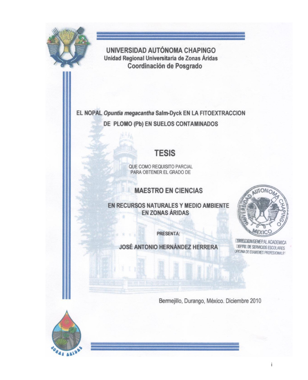 El plomo, es uno de los contaminantes más peligrosos en las regiones áridas y semiáridas del norte de México. En Bermejillo, Durango hay una planta fundidora que emite 178 toneladas de plomo al año. La fitorremediación es una técnica que permite capturar los iones de los metales pesados y extraerlos por medio de vegetales y disminuir el riesgo de afectaciones. El nopal (Opuntia megacantha Salm-Dyck) es un especie potencial para la fitoextracción de metales pesados del suelo. En mayo de 2007, en condiciones de invernadero se estableció un experimento con nopal (O. megacantha Salm-Dyck) bajo un diseño de bloques al azar con tres repeticiones. Los factores variables fueron: dosis de plomo (0, 150, 300 y 450 mg Pb Kg-1) y dosis de fertilización con fosfonitrato (0,50, 100 y 150 mg N Kg-1 de suelo). A los 218, 335 y 439 días después de plantación (ddp) se tomaron muestras de los cladodios y se analizaron en un espectrofotómetro de absorción atómica. Asimismo se determinó peso fresco, largo y ancho de cladodios y se estimó el área foliar. Los datos se analizaron con el programa STATISTICA 7.0. La fertilización nitrogenada no tuvo efecto significativo en la extracción del Pb por el nopal. Tanto el tiempo de exposición al metal como la concentración de metal pesado en el sustrato tuvieron efectos significativos sobre la acumulación de Pb en el nopal., La concentración del plomo en el sustrato afectó significativamente el peso fresco de los cladodios.