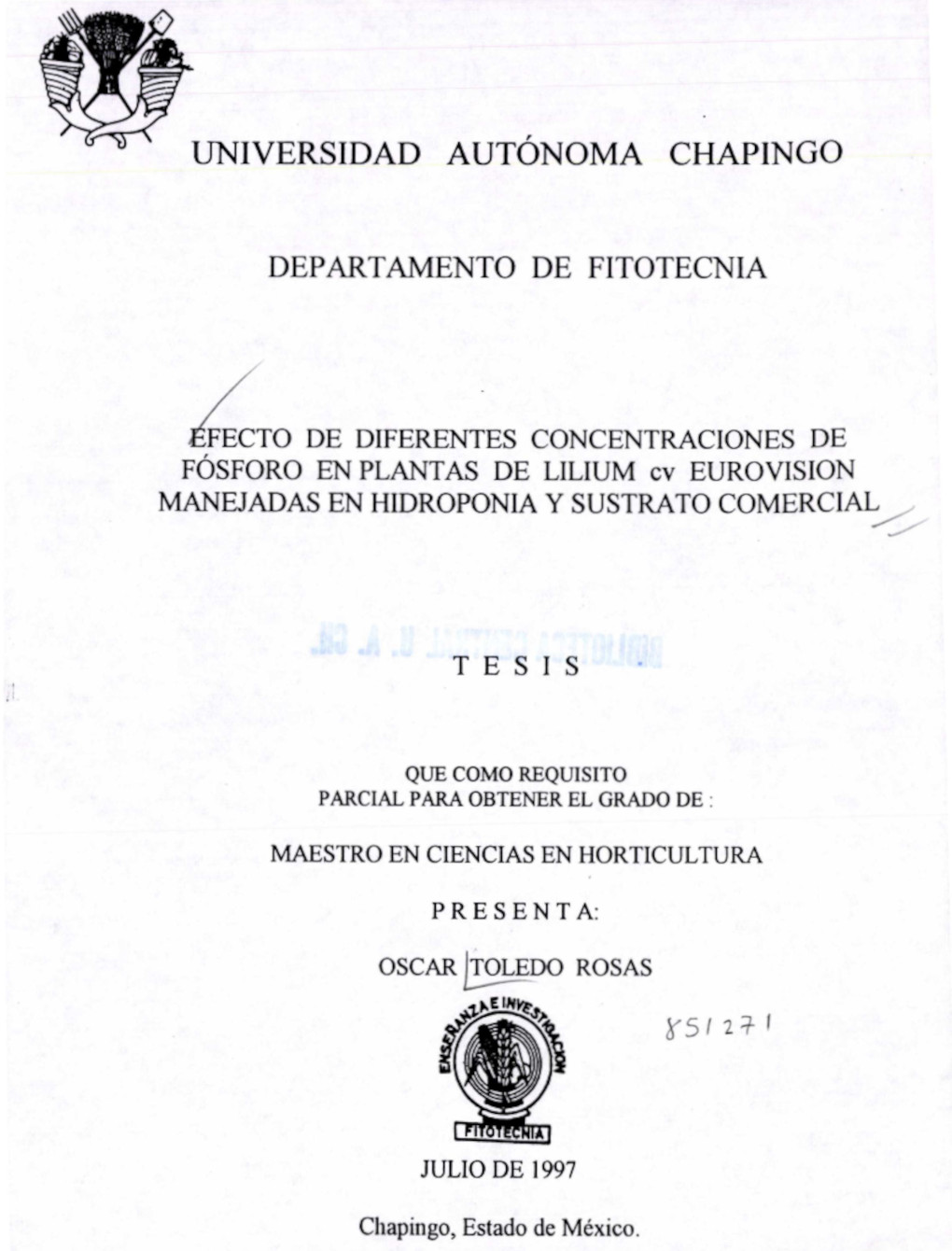 Por otro lado, el incremento en Ia concentración de fósforo en Ia solución nutritiva, provocó incrementos estadísticamente significativos en el peso seco de hojas, raíz, tallo e inflorescencia; así como también en en el diámetro apical del tallo y el calibre y peso del bulbo. En lo que se refiere al nivel nutrimental de Ia planta, se observó que los incrementos de fósforo en Ia soluci6n nutritiva, causaron un incremento en Ia concentración de nitrógeno, fósforo y calcio en las hojas de las plantas. Las concentraciones de 50 y 100 ppm de fósforo fueron las que produjeron los mayores incrementos en las variables antes mencionadas. Se pudo comprobar que las plantas de Lilium manejadas en hidroponia tuvieron menor peso seco de hojas, raíz, tallo e inflorescencia, así como menor calibre y peso del bulbo y menor diámetro de tallo que las plantas manejadas en sustrato comercial. También se observó que el uso de ácido fosfórico en Ia solución nutritiva como fuente de fósforo, dio como resultado plantas de Lilium con mayor calibre y peso del bulbo; mayor peso seco de hojas, raíz, tallo e inflorescencia y mayor diámetro apical del tallo, en comparación con el resultado que se obtuvo en las plantas en donde Ia fuente de fósforo fue el superfosfato de calcio triple, en las mismas concentraciones. Por último, también pudo comprobarse que el uso de superfosfato de calcio triple en dosis de 2 kg/m3 de substrato, no causa síntomas de daños por flúor en plantas de Lilium cv Eurovision.